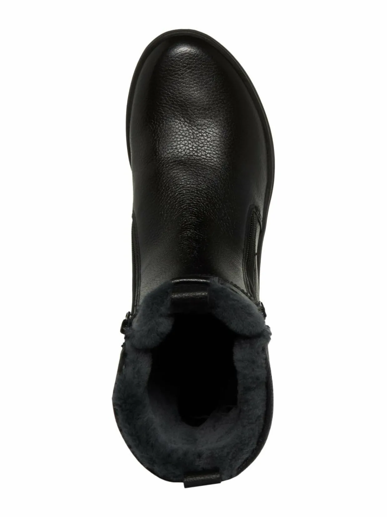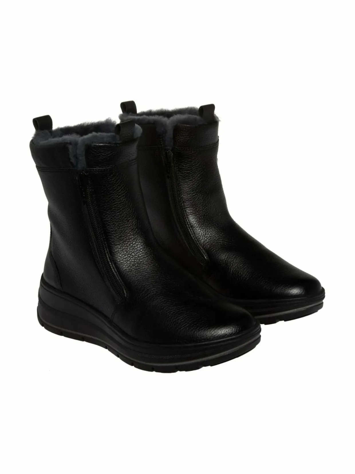 Aran Calais H-last Two Zippers -nilkkureissa on rakeinen nahkapinta. Sisäpuoli on vuorattu lämpimällä, jalkoja hellivällä lampaanturkiksella. Kengät ovat vaivattomat pukea ja riisua päällisen kahden vetoketjun ansiosta.