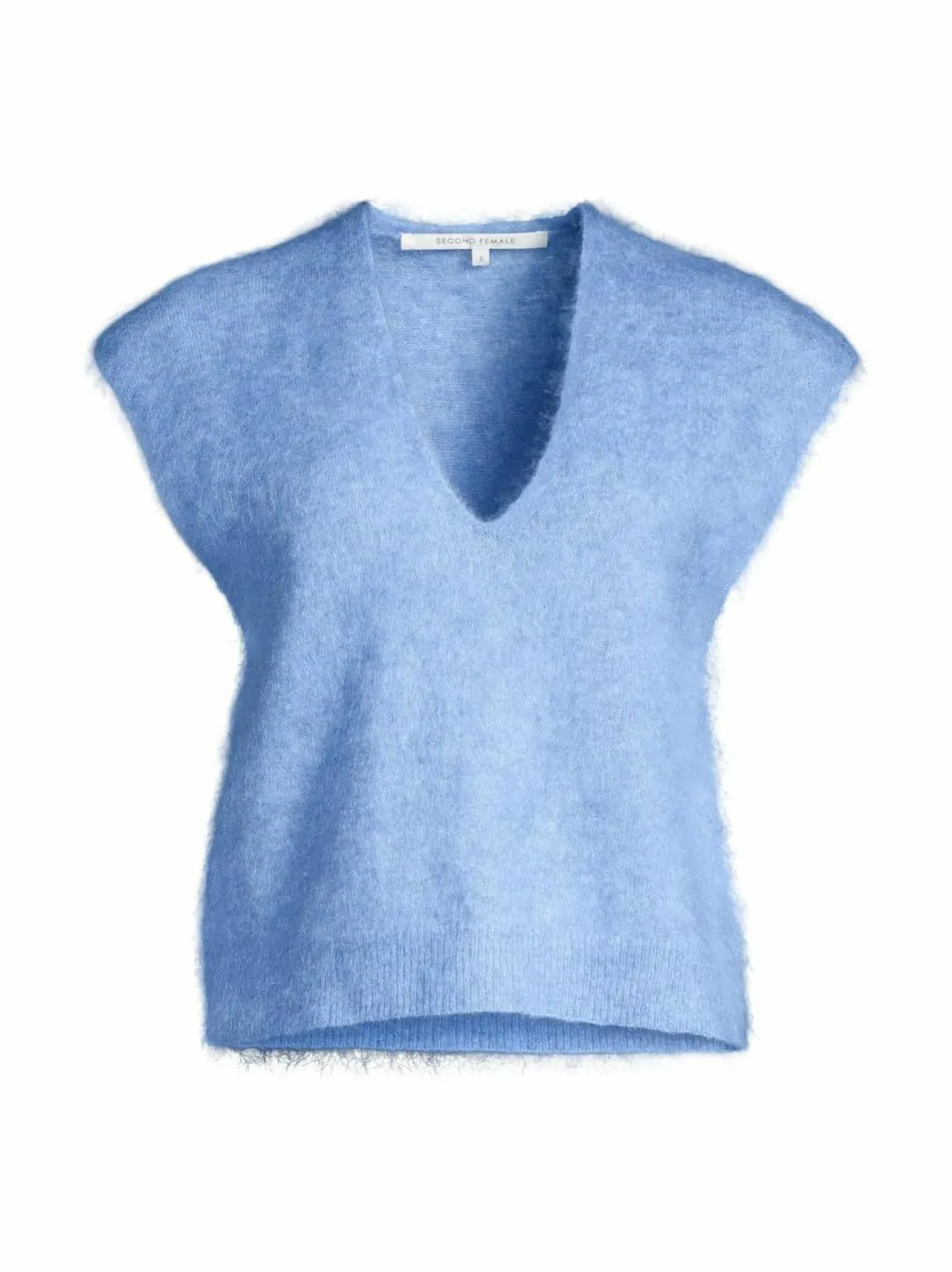 Rento ja lämmin neuleliivi Second Female vaatemerkiltä. Pehmeä ja pörröpintainen neule on valmistettu mohairsekoitteesta, joka on mukavan joustavaa laatua. Liivissä on syvä V-pääntie ja resorihelma. Sivuilla pienet halkiot. Löysä istuvuus.