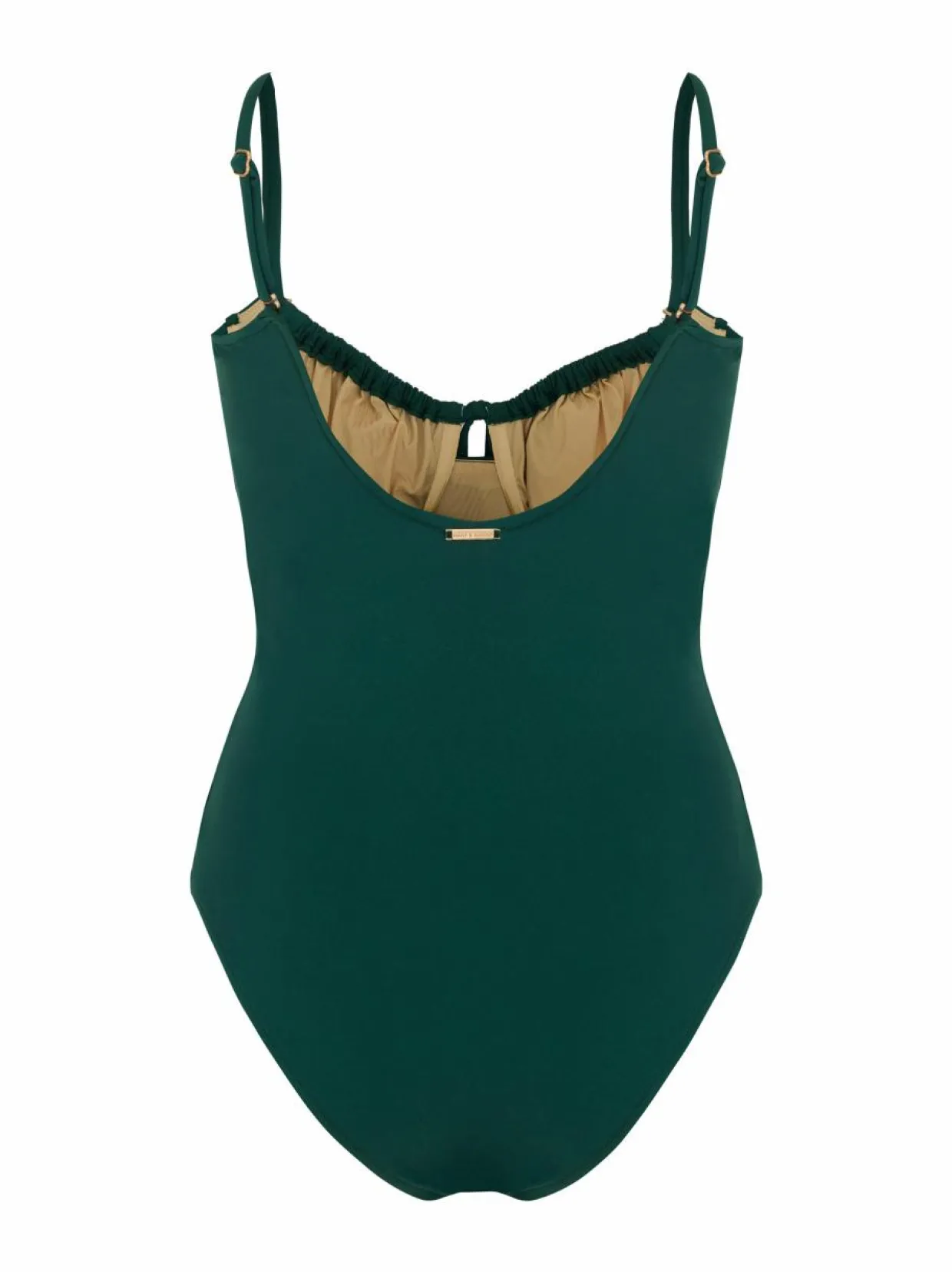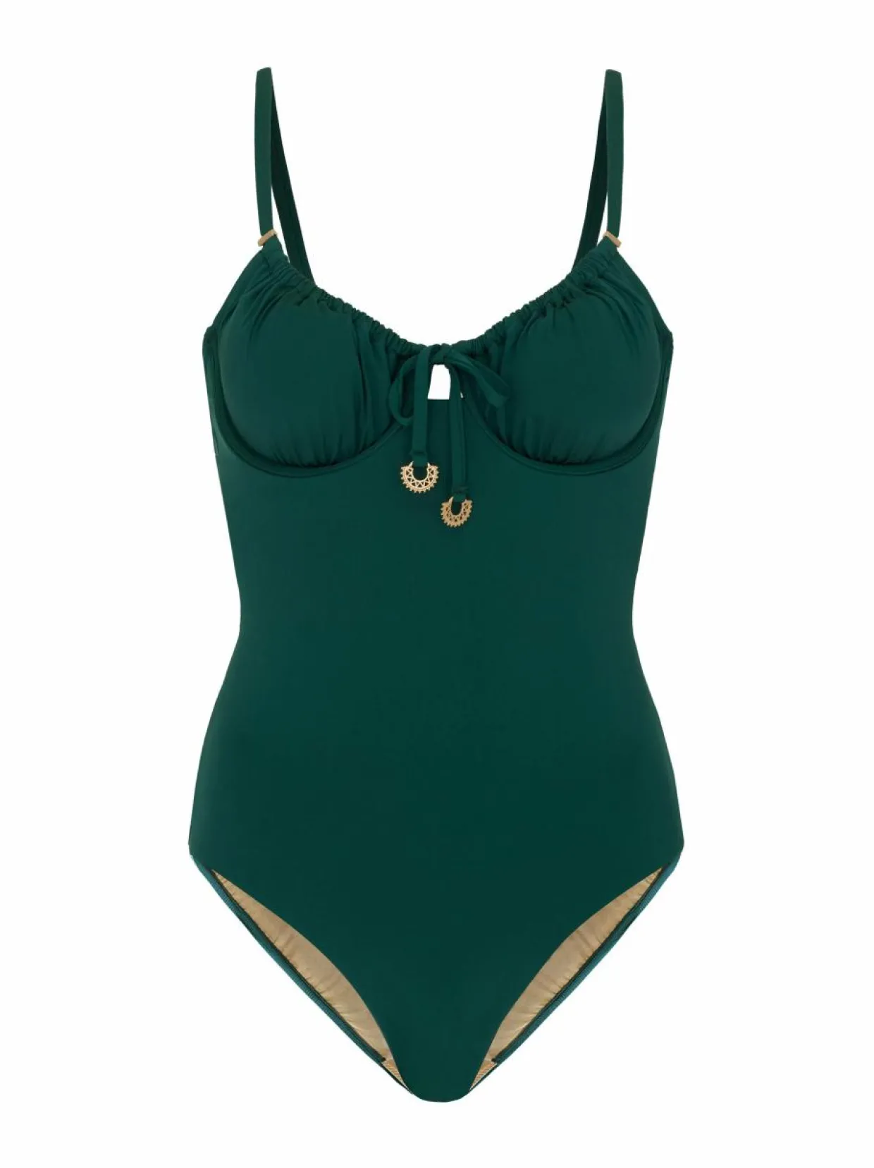 Capricious-uimapuku on tyylikäs ja mukava valinta uima-altaalle tai rannalle. Uimapuvussa on pehmeät kupit, joissa on poistettavat pehmusteet. Se on täysin vuorattu ja siinä on muotoileva powermesh-vuori edessä. Säädettävät olkaimet lisäävät käyttömukavuutta ja yksilöllistä istuutta voi säätää edessä olevien kiristysnauhojen avulla. Kultaiset yksityiskohdat nauhojen päässä viimeistelee elegantin tyylin.