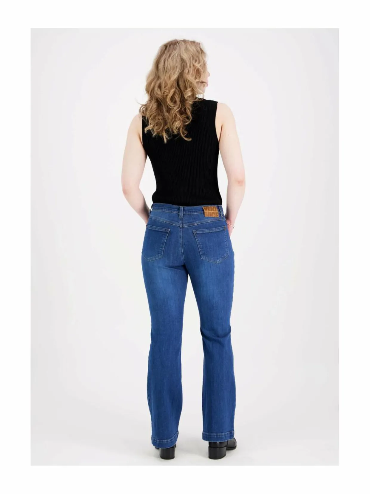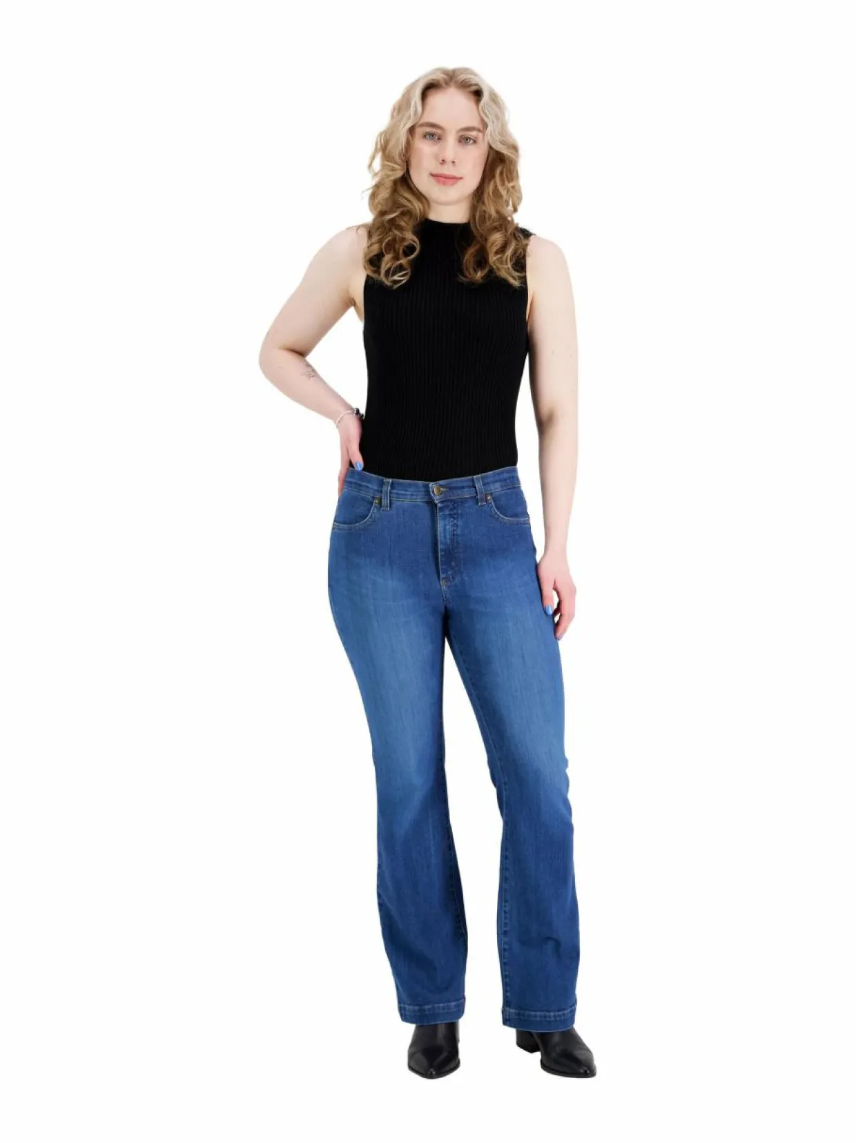 Very Nice Caramel Flare -farkuissa on erittäin korkea ja kapea vyötärö korostavat takamusta ja ryhtiä. Vyötärökorkeus on takaa korkeampi kuin edestä, joka parantaa housujen istuvuutta entuudestaan. Kurveillesi on annettu tilaa reidellä ja lantiolla. Lahje lähtee levenemään polven kohdalta ja luo imartelevan boot cut -lahkeenlinjan. Farkuissa on tyylikäs tummansininen pesu ja kevyt laserkulutus. Materiaali on miellyttävän pehmeä ja joustava. Kaikki Very Nice -farkut suunnitellaan Suomessa ja valmistetaan omalla tehtaalla Virossa.
