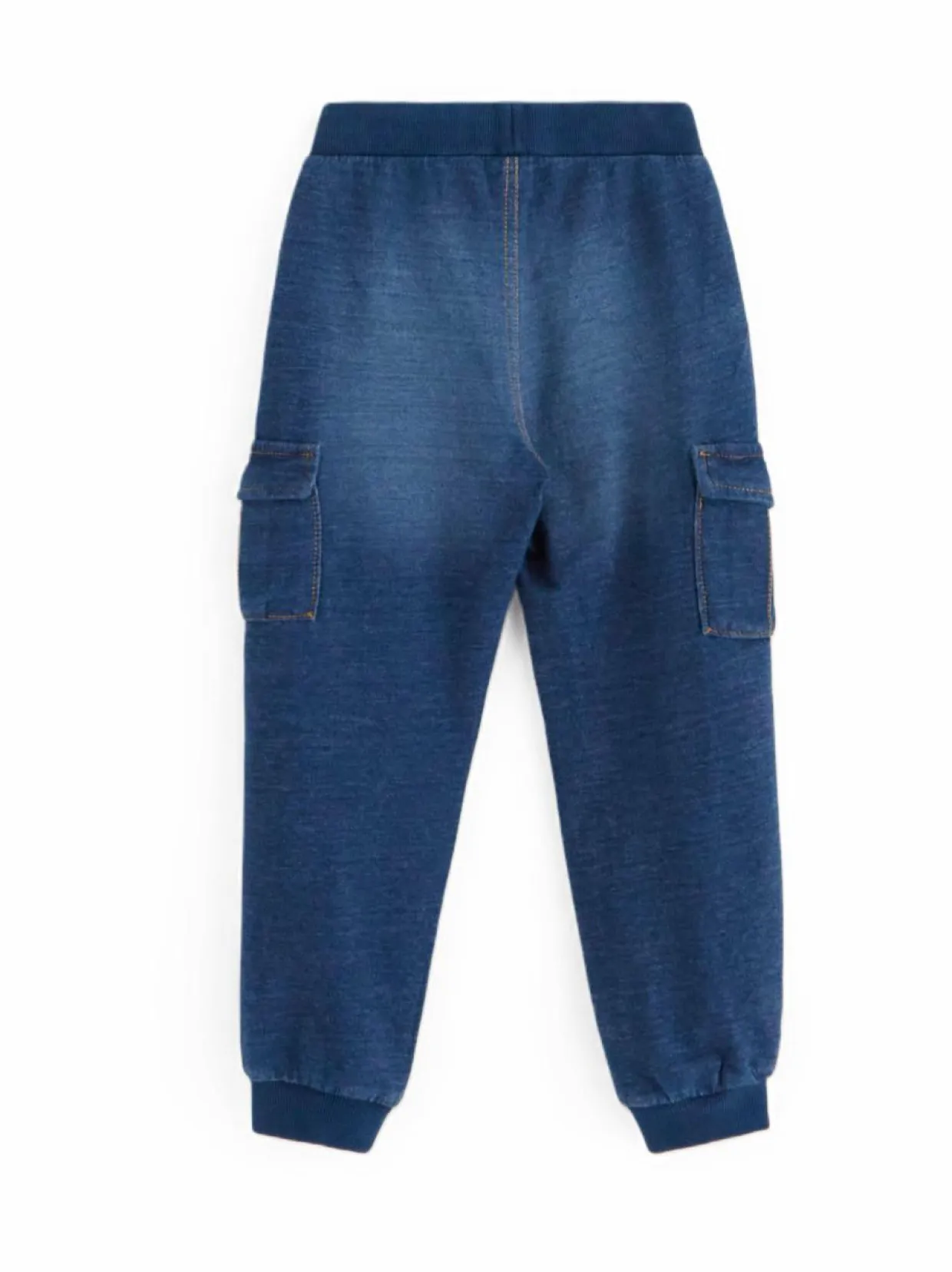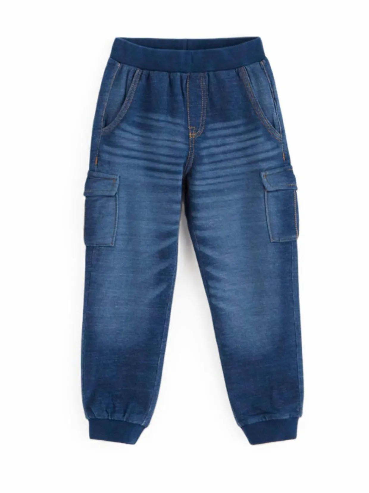 Lindexin pehmeät ja mukavat cargo-housut, jotka on valmistettu puuvillatrikoosta. Housuissa on denim-tyyli ja reisitaskut sivuilla. Cargo-housuissa on joustava, säädettävä vyötärönauha ja ribatut lahkeensuut.