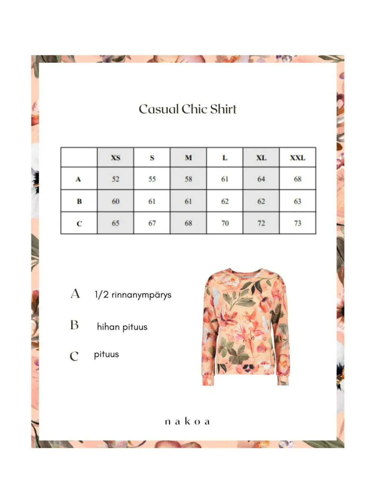 Casual Chic Shirt ovat helppo valinta niin toimistolle kuin kaupungille! Collegepaita on vaatekaapin luottotuote, joka on helppo valinta jokaiseen päivään. Casual Chic Shirt istuu kauniisti niin farkkujen kuin hameiden parina. Pukemalla alle kauluspaidan, saat kauniin toimistolookin. Asusteilla ja koruilla on helppo luoda vaihtelua haluamaasi tyyliin. Kangas on kauniisti laskeutuvaa, ohutta GOTS-sertifioitua collegea. Kangas tuntuu miellyttävältä yllä.