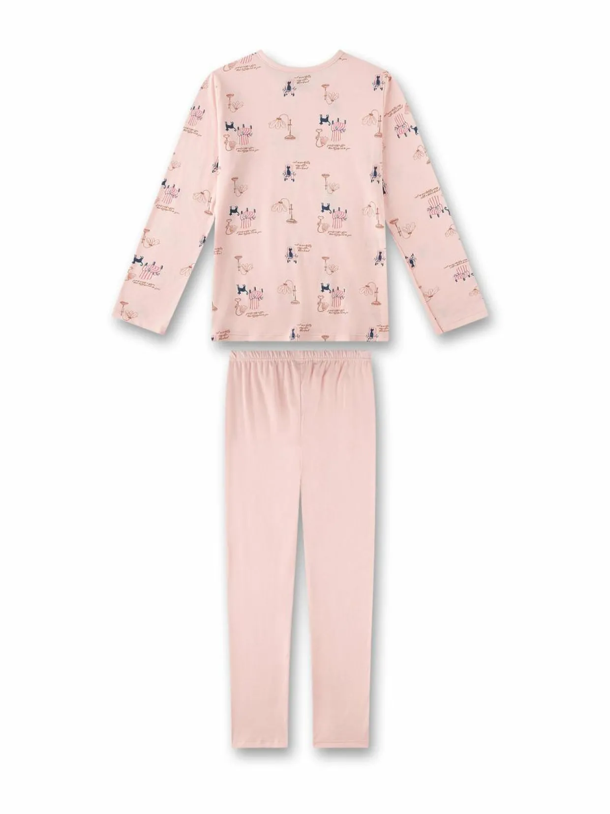 Sanettan kissakuvioitu pyjamasetti on iholla miellyttävän pehmeältä tuntuvaa ja helppohoitoista puuvilla-modaalisekoitetta, joka pysyy hyvänä pesusta toiseen. Pyjamahousuissa on joustava vyötärö.