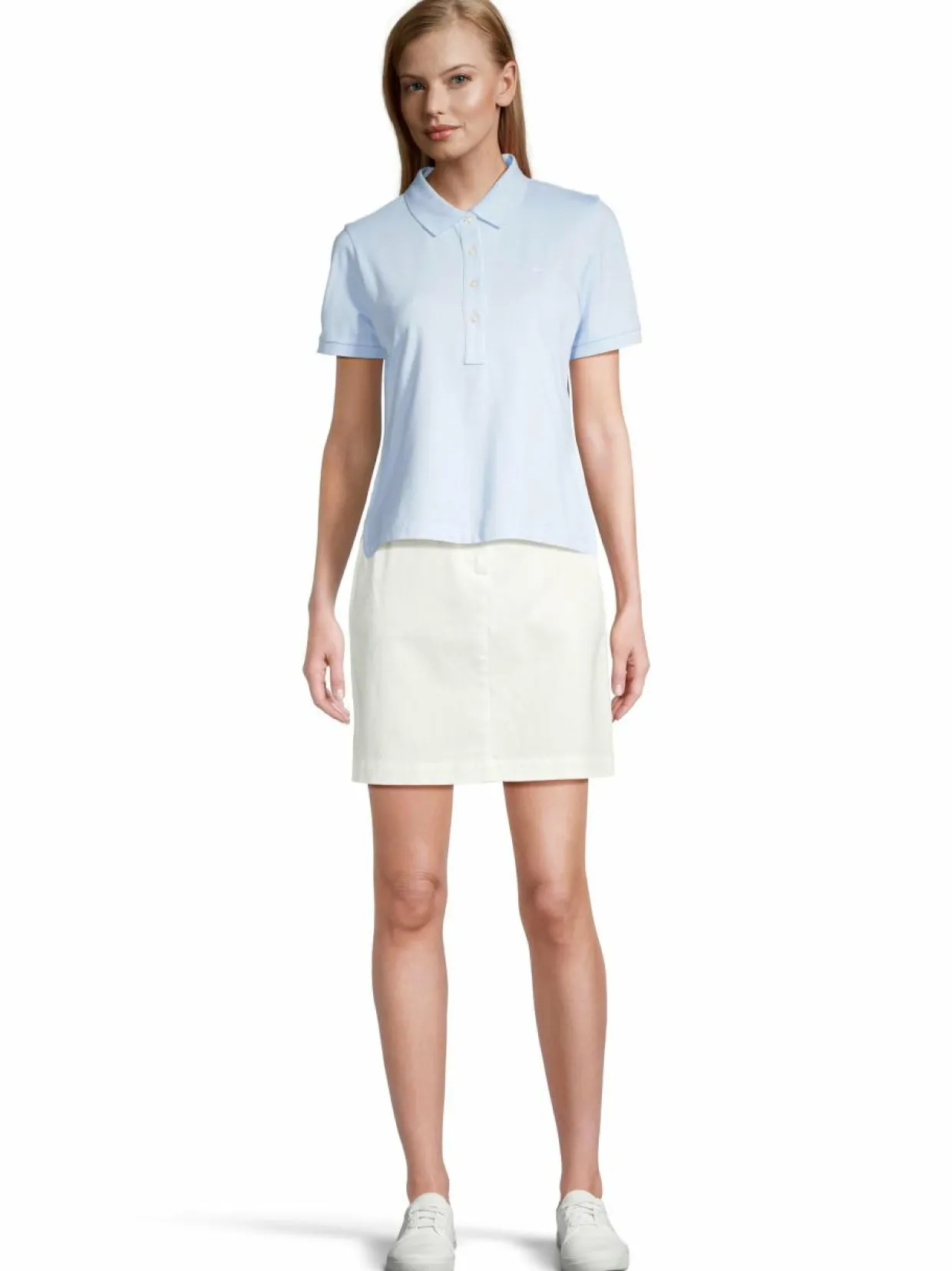 Gant-merkin Chino-hame on valmistettu pehmeästä ja mukavasta materiaalista, joka on valmistettu luomupuuvillasta, modaalista ja polyamidista. Hameessa on klassinen a-linjainen istuvuus ja sen pituus on hieman polven yläpuolella. Hameessa on kaksi taskua edessä ja kaksi taskua takana. Hameessa on vetoketju ja napit edessä. Luomupuuvilla on ympäristöystävällinen vaihtoehto tavalliselle puuvillalle, koska sen viljelyssä ei käytetä keinotekoisia lannoitteita tai torjunta-aineita.