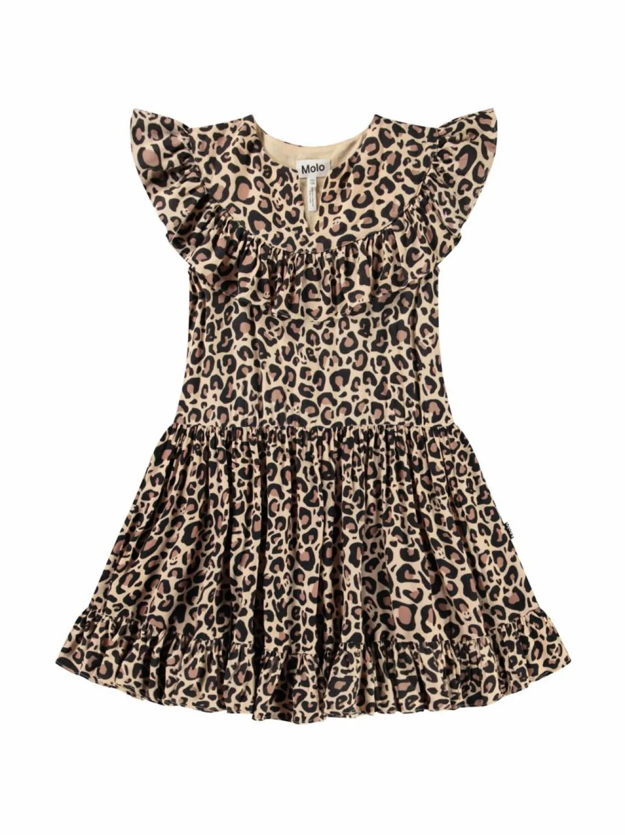 Molon Cho-mekko on valmistettu pehmeästä viskoosista ja siinä on kaunis leopardikuosi. Mekossa on rypytetty ja kellotettu helma. Yksityiskohtana näyttävä frillareunus.