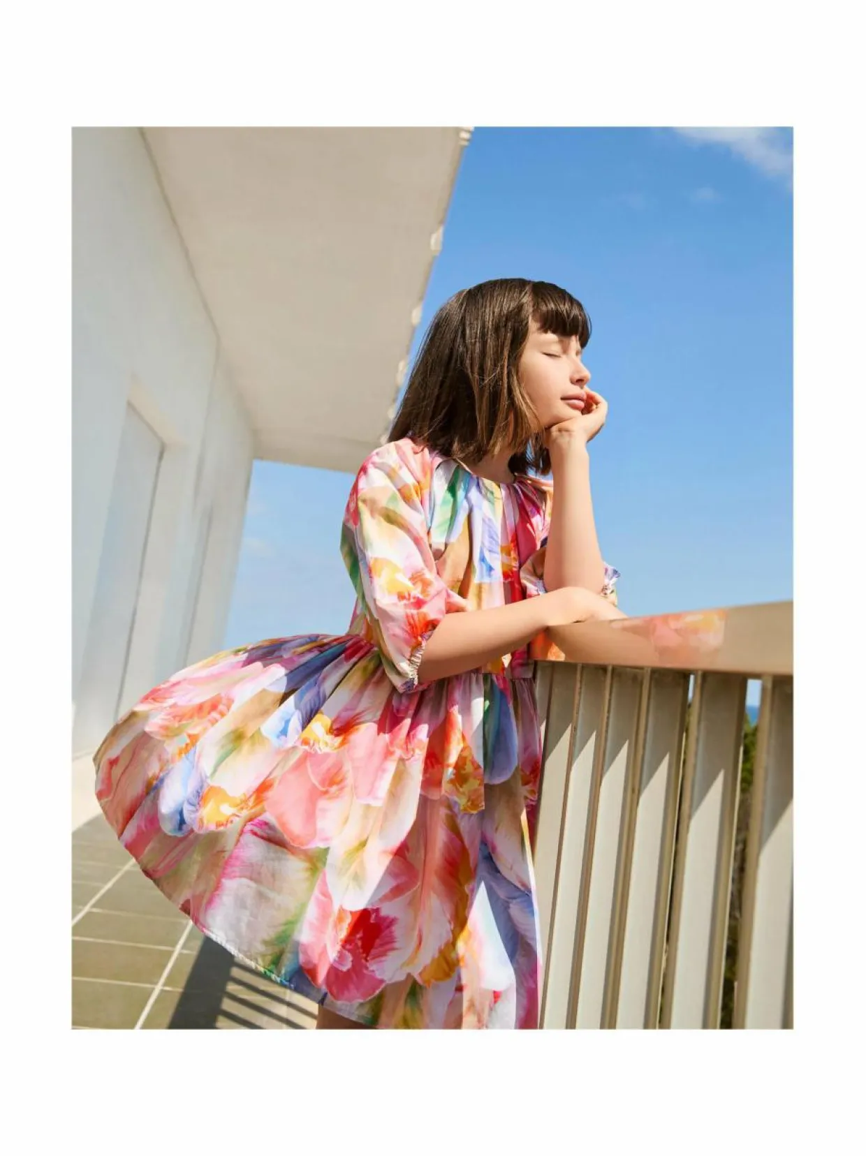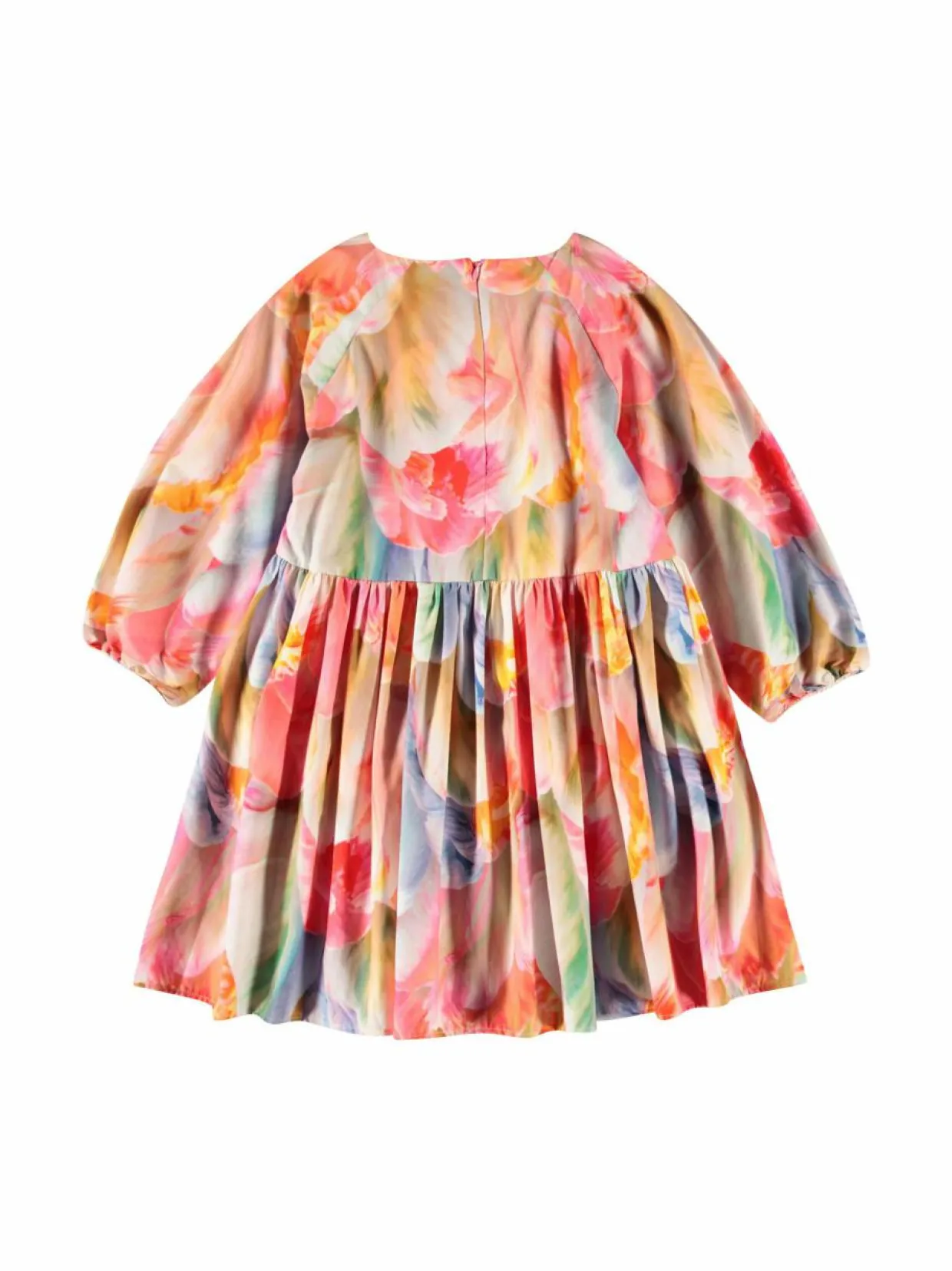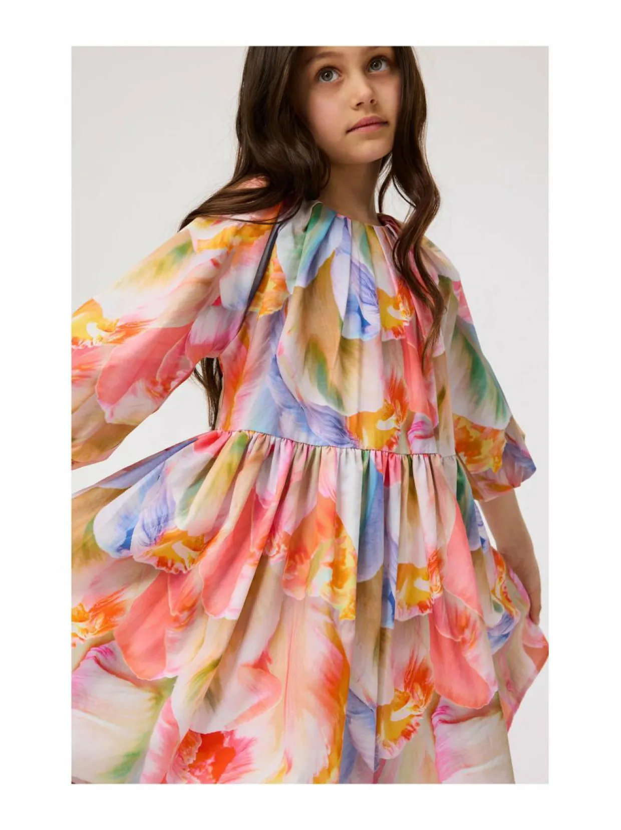 Molon Ciera-mekko on valmistettu pehmeästä luomupuuvillasta ja siinä on hieno tulppaanikuosi. Kukkamekossa on pyöreä pääntie ja 3/4-pituiset hihat. Se on rento ja mukava käyttää. Selässä on vetoketju. Tässä mekkomallissa on kauniit rypytykset miehustassa ja helmassa.