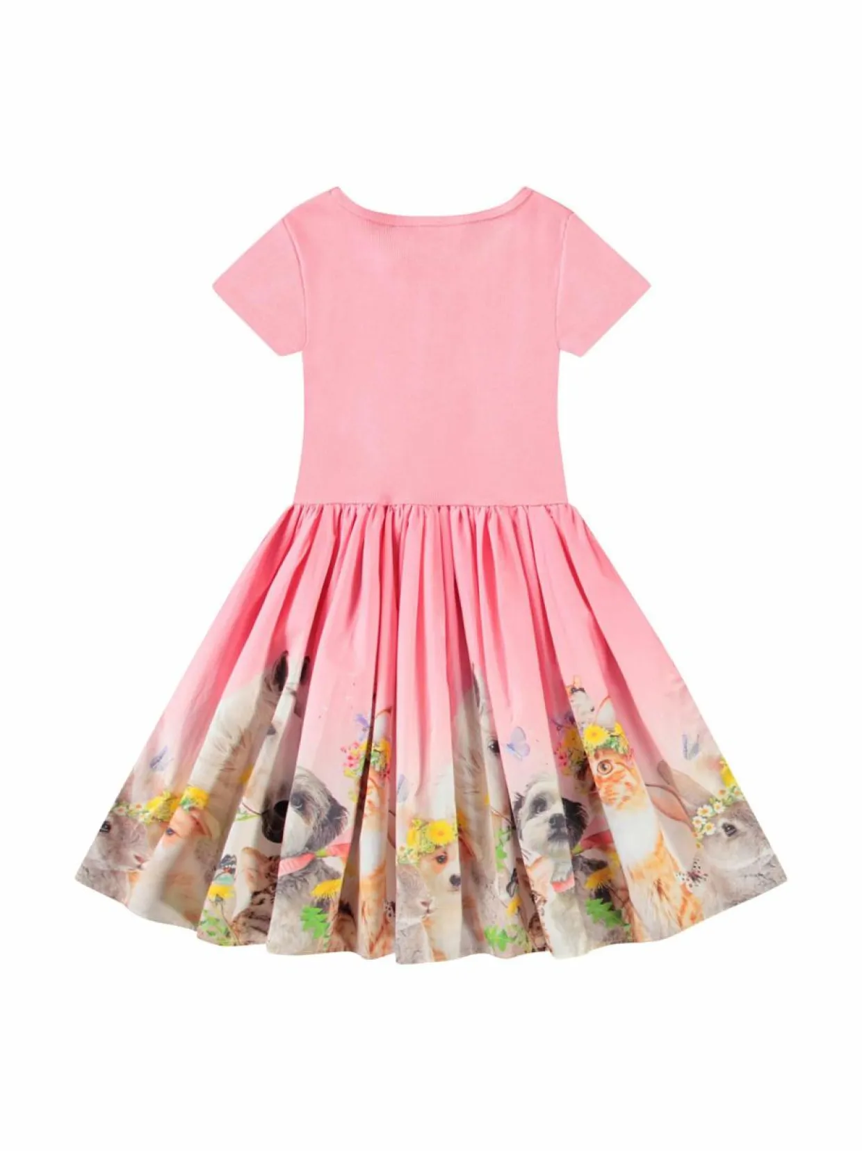 Molon Cissa-mekko on valmistettu pehmeästä luomupuuvillasta. Mekossa on lyhyet hihat ja pyöreä pääntie. Mekon helma on kauniisti rypytetty ja kellotettu, ja siinä on söpö eläinkuosi. Mekko sopii täydellisesti sekä arkeen että juhliin. Vaate on mukava ja helposti puettava.