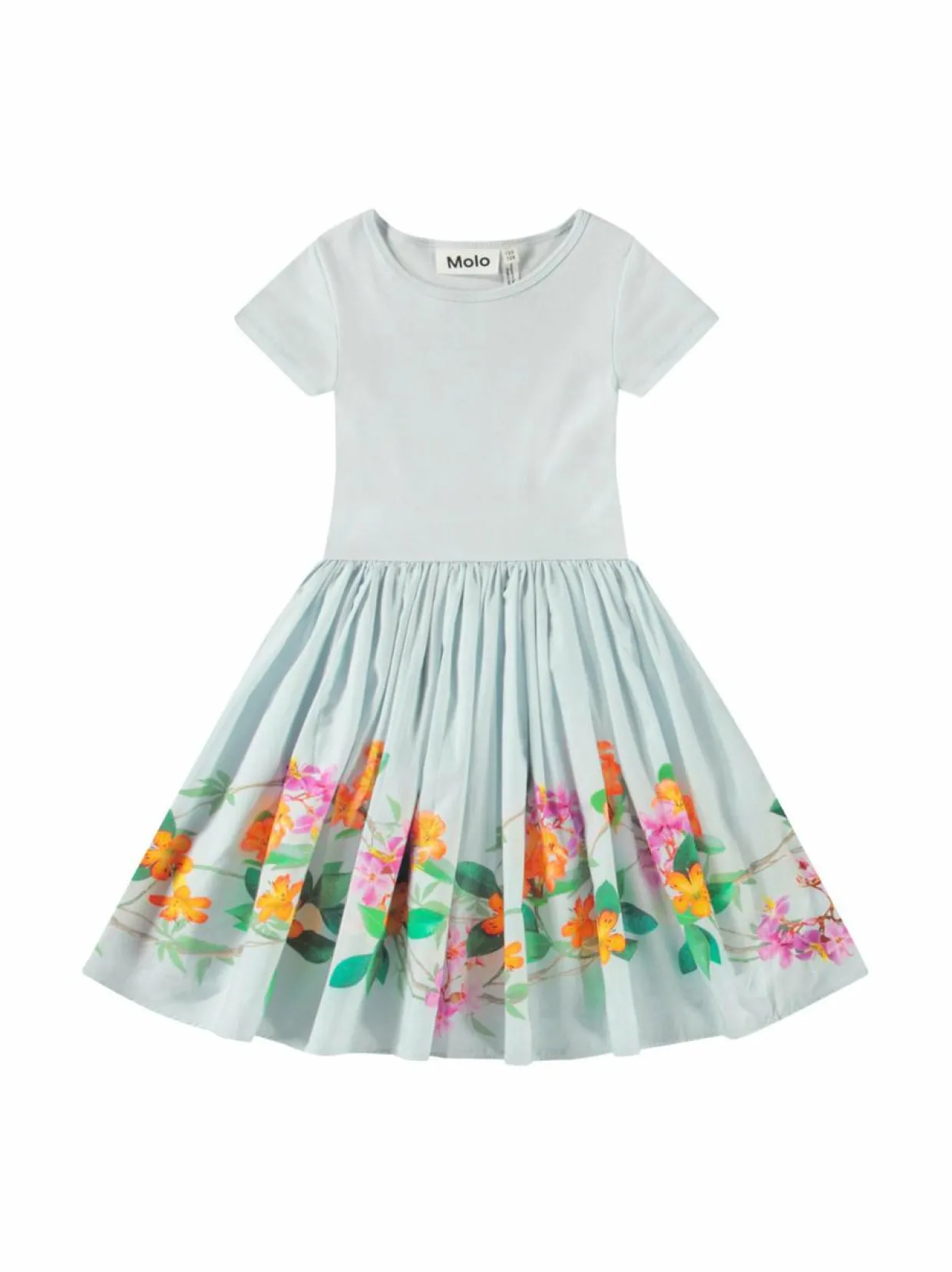 Molo-merkin värikäs lyhythihainen mekko lapsille. Sen yläosa on ribattua ja joustavaa laatua. Helma on kauniisti kellotettu ja rypytetty. Cissa-mekko on valmistettu pehmeästä luomupuuvillasta.