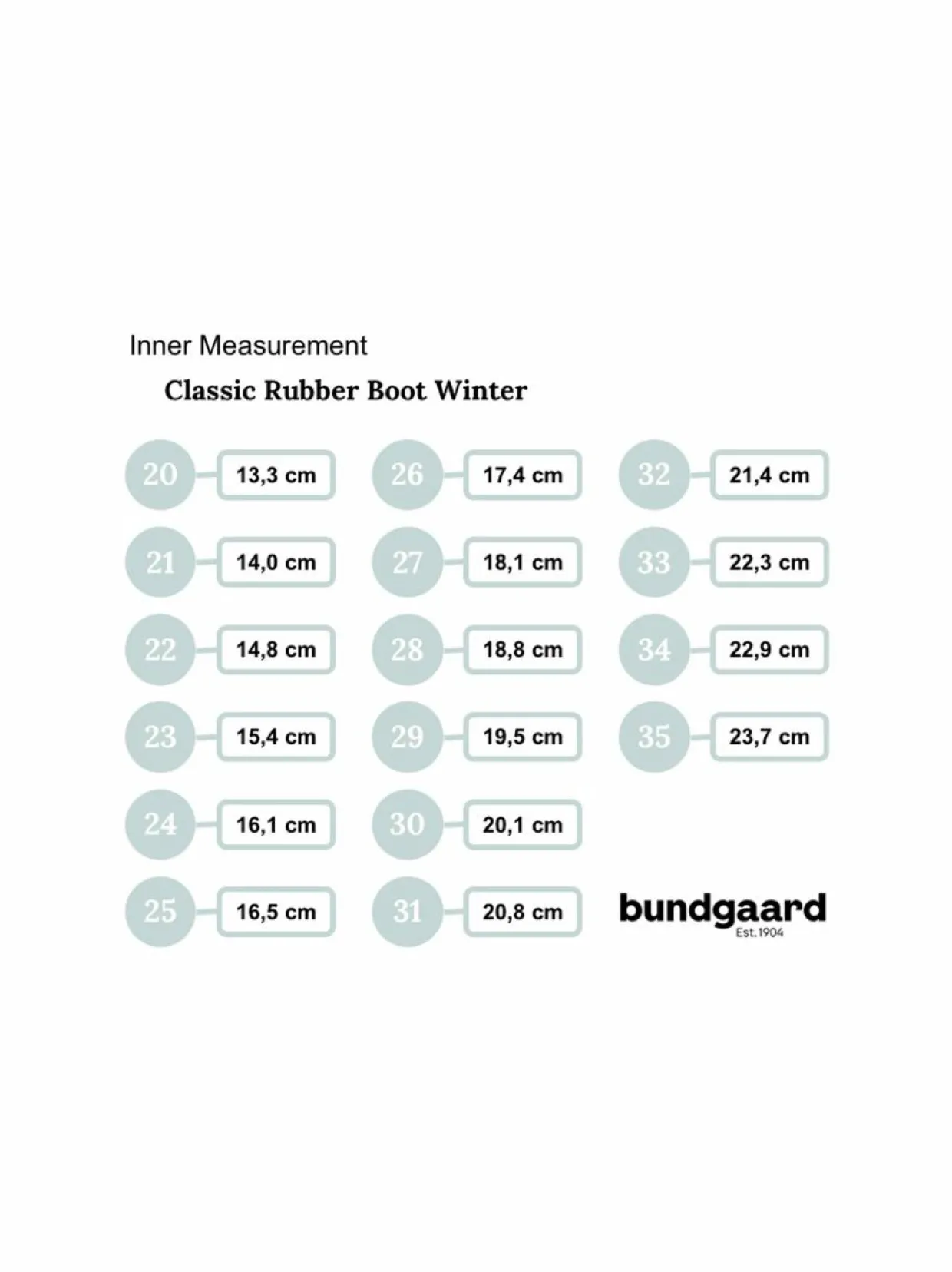 Lämpimät villavuorelliset kumisaappaat ovat kevyt ja kestävää luonnonkumia. Kumisaappaat ovat Bundgaardin Zero Heel -mallistoa, joten niissä ei ole kantakorotusta, ne ovat tavallisia talvikumisaappaita joustavammat ja ohutpohjaisemmat. Kantapää on hieman kapeampi, joten jalat istuvat hyvin saappaissa. Leveä ja tilava varvastila varmistaa, että varpaille jää riittävästi tilaa edessä. Nämä talvikumisaappaat ovat täysin vedenpitävät ja niiden karvavuori on villasekoitetta (villaa ja Dacron-polyesterikuitua), joka lämmittää mukavasti pieniä varpaita. Irrotettava paksu thermopohjallinen villaa.