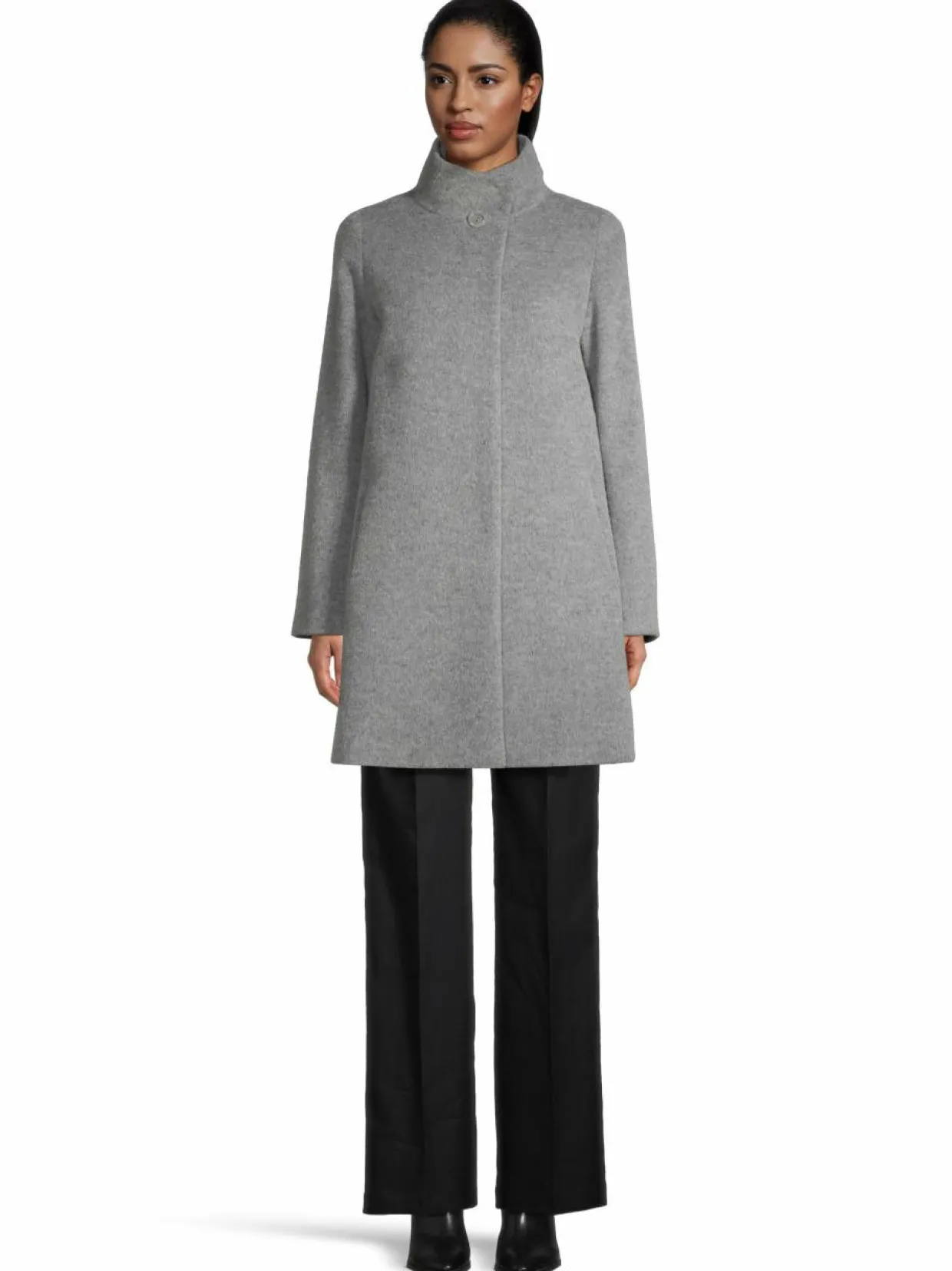 Cinzia Rocca Classic Stand Collar -villakangastakki on suunniteltu modernilla siluetilla. Sen selkeät linjat ja yksinkertainen muotoilu tekevät siitä monipuolisen valinnan. Siinä on korkea kaulus ja yksirivinen napitus. Materiaali on sekoitus villaa, alpakanvillaa sekä polyamidia, joka tarjoaa pehmeän ja lämpimän tunteen. Pituus noin 85 cm.