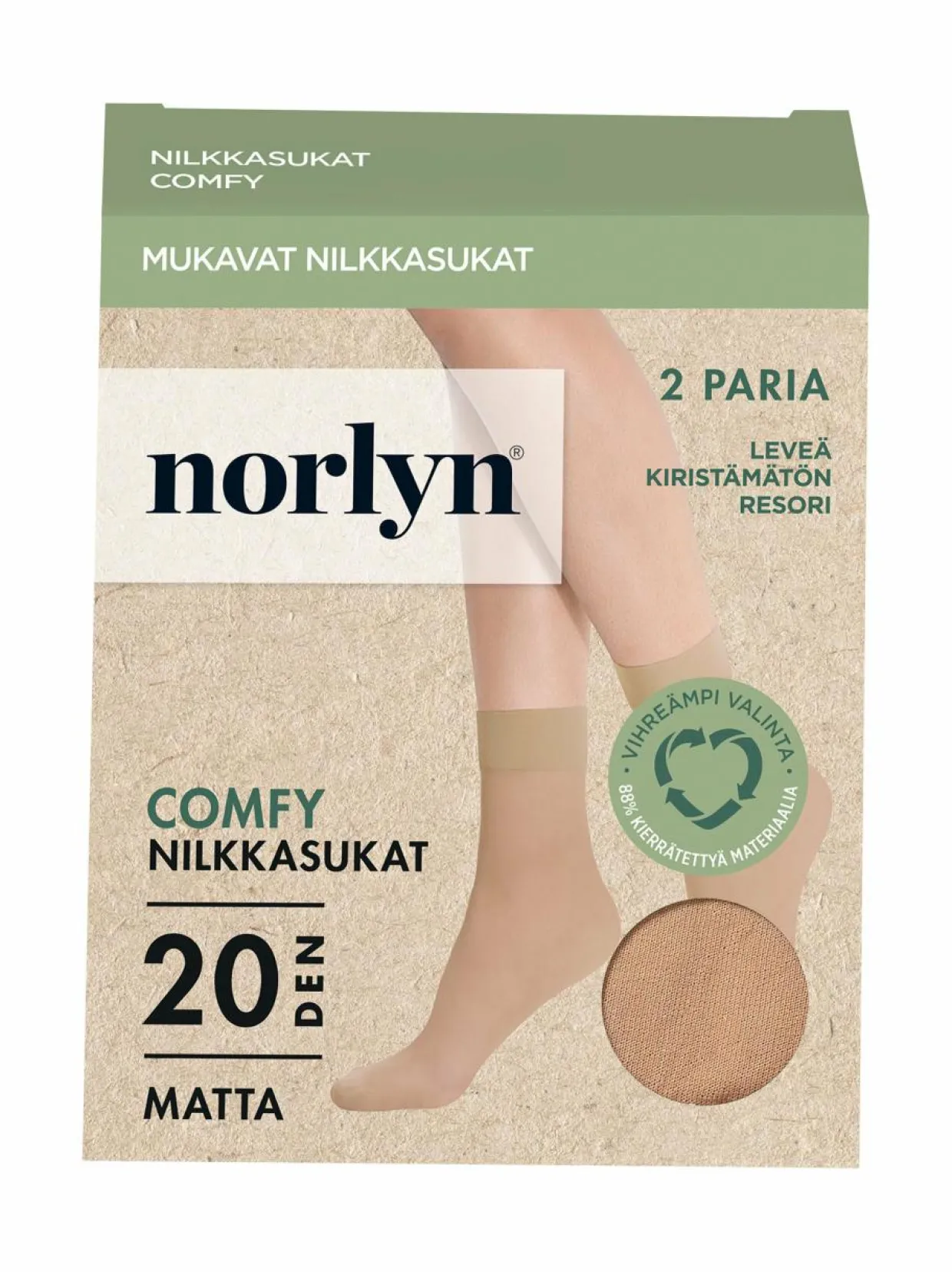 Norlyn Comfy Matt 20 denierin nilkkasukat on valmistettu materiaalista, josta 53 % on kierrätyspolyamidia. Sukissa erittäin pehmeä ja leveä resori lisäämässä käyttömukavuutta sekä huomaamaton kärkivahvike. Ihanat mattapintaiset nilkkasukat kahden parin pakkauksessa.