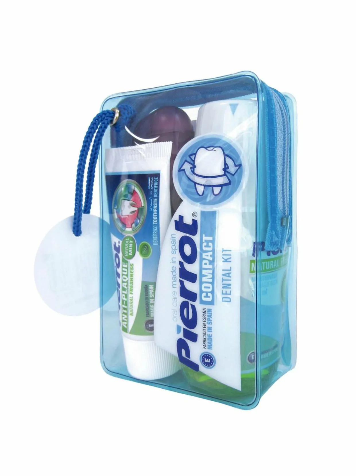 Pierrot Compact Dental Kit -matkapakkaus sisältää matkahammasharjan, hammastahnan 30 ml, suuveden 10 ml sekä laajenevan hammaslangan 30 m.
