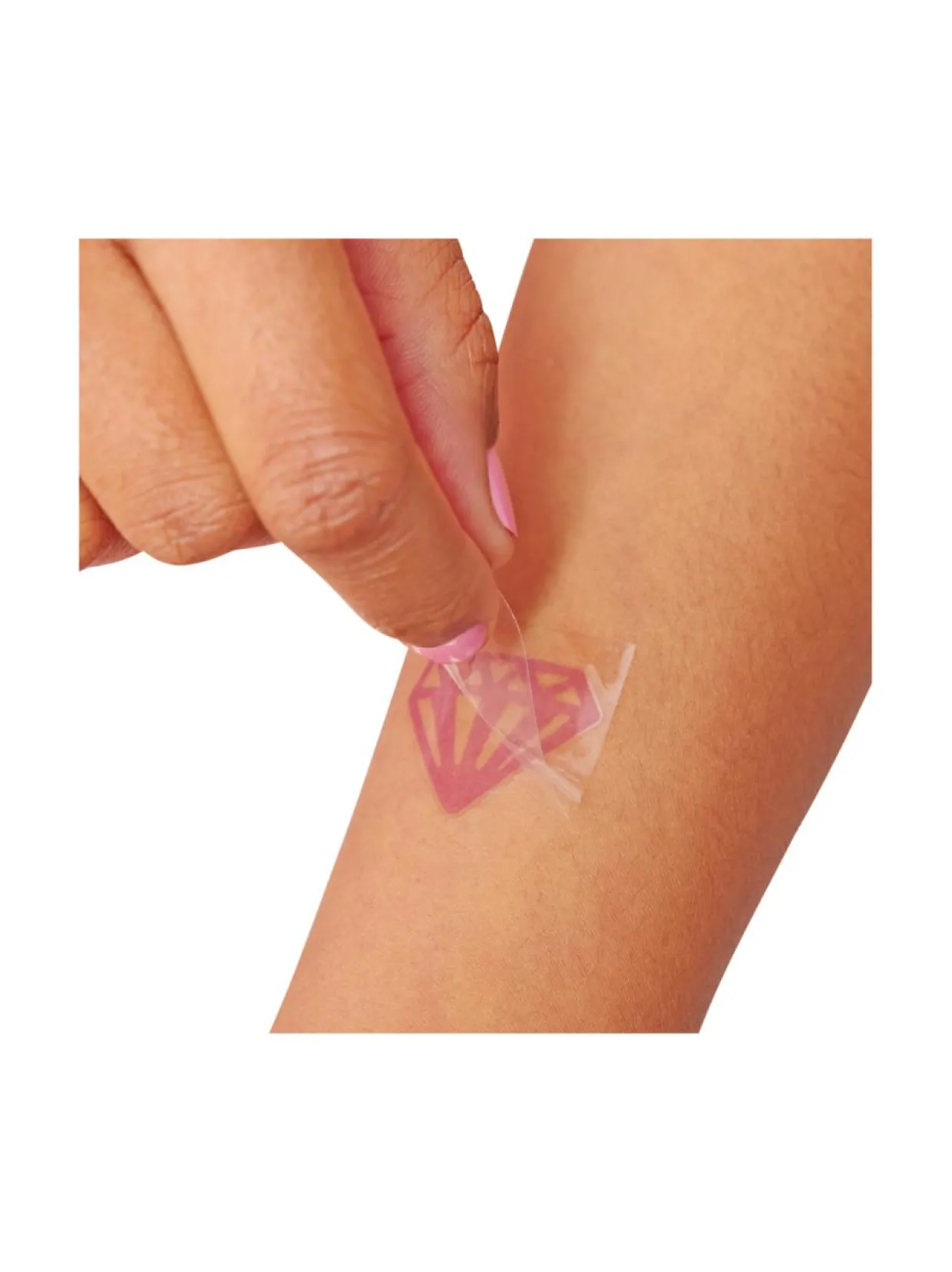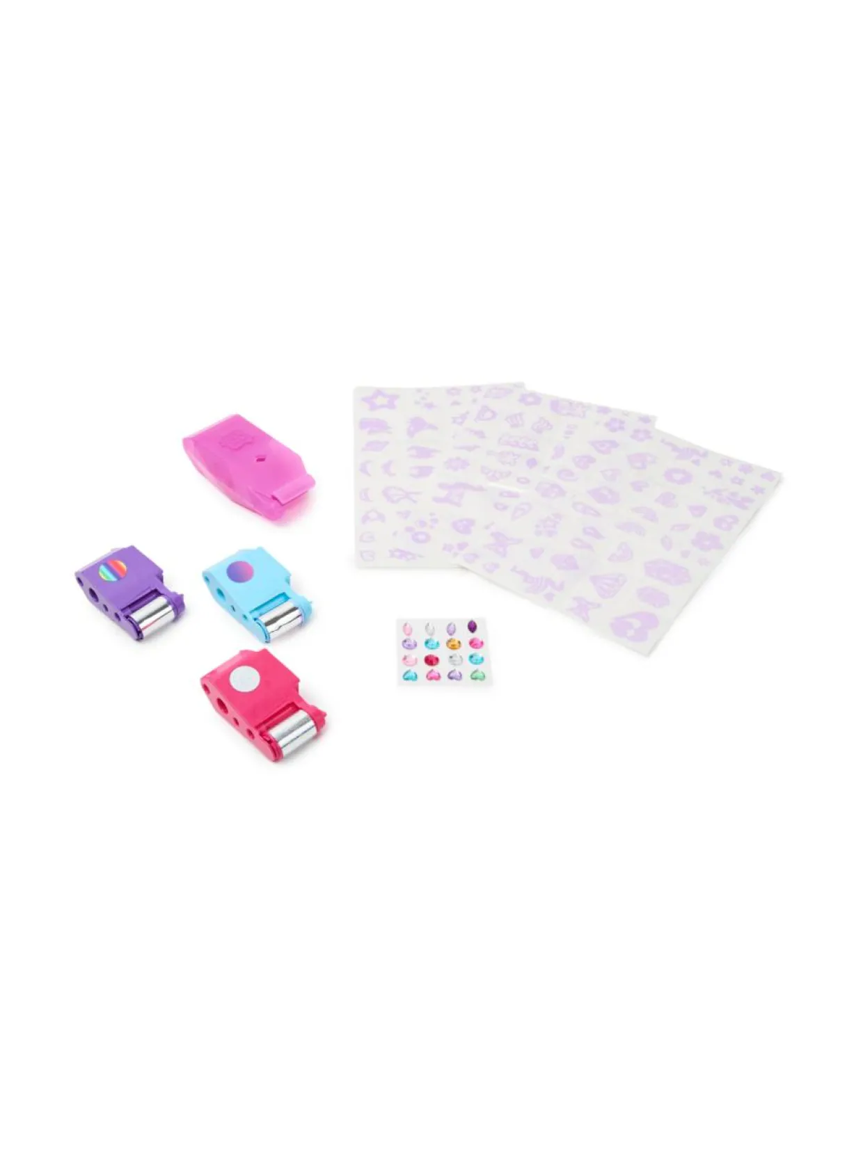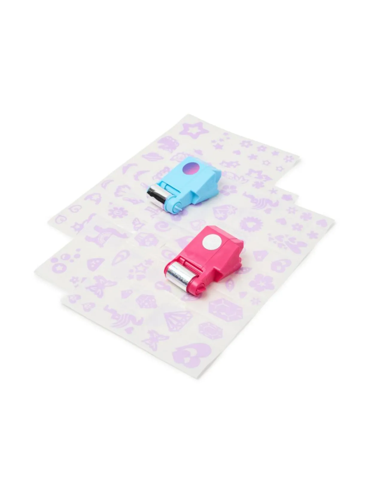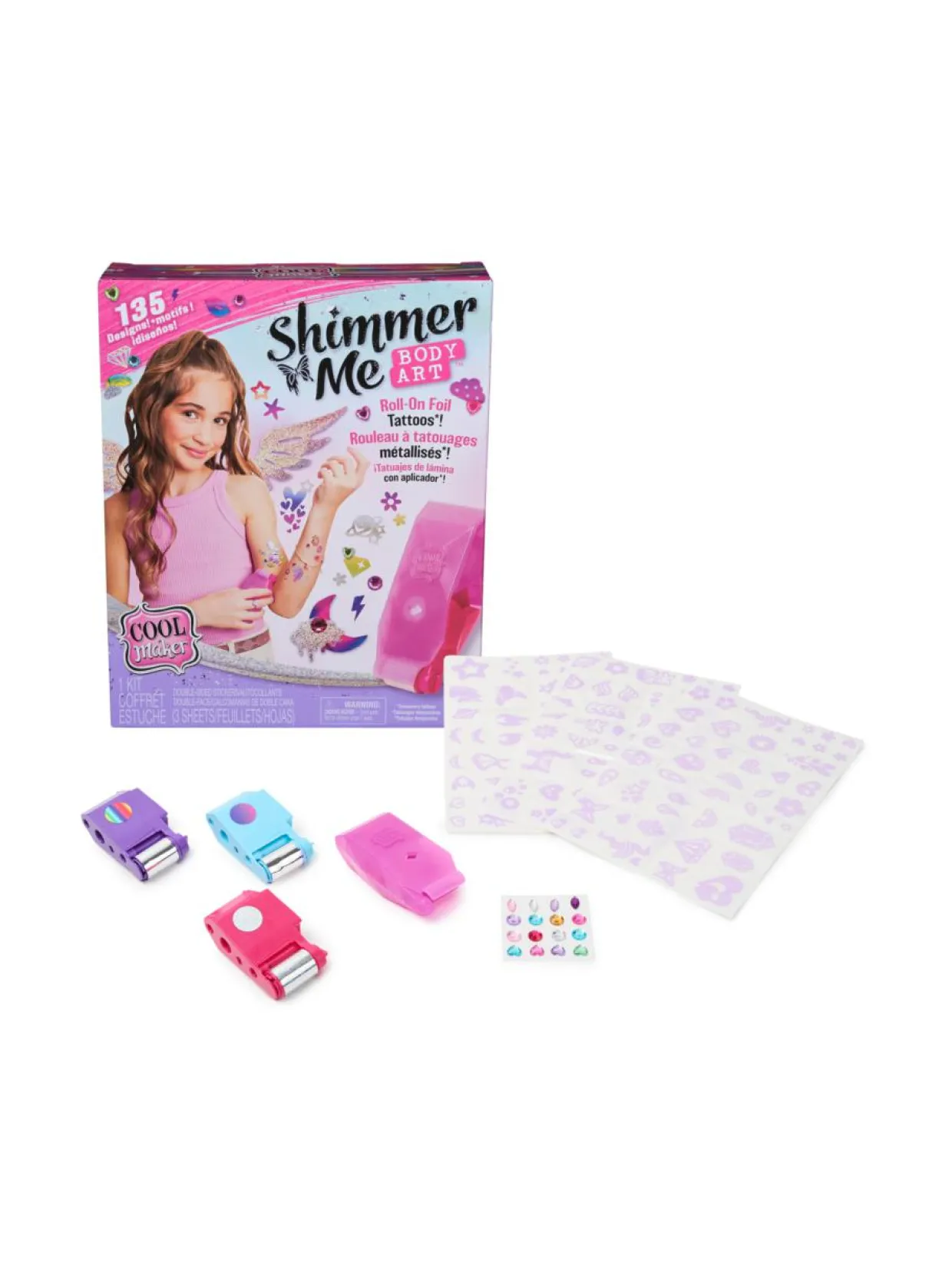 Suunnittele upeita foliotatuointeja Cool Makerin Kimalla-leikkitatuointisetin avulla. Lasten leikkitatuointisetti innostaa luovuuteen ja kasvattaa itseluottamusta, kun lapset ilmaisevat omaa tyyliään ja tekevät väliaikaista vartalotaidetta. Pakkauksessa on 135 trendikästä ja söpöä kaksipuolista tarraa, 3 foliorullaa, ihotimantteja ja helppokäyttöinen rulla, joten lapset voivat yhdistellä ja muokata tatuointeja miten haluavat. Lasten leikkitatuointien kiinnittäminen on helppoa: puhdista tatuoitava alue, valitse värikäs folio rullaan: hopean värinen, violetista vaaleanpunaiseen liukuvärjätty tai sateenkaaren värinen ja aseta tarra iholle. Poista läpinäkyvä suoja tarran päältä ja liu´uta rullaa sen yli, jolloin metallinhohtoinen foliokuvio paljastuu. Lapset voivat koristella tatuointia värikkäillä ihotimanteilla ja yhdistellä eri värisiä folioita ainutlaatuisen tatuoinnin luomiseksi. Jokaisessa rullassa on 116 cm foliota yhä uusien tatuointien tekemiseen.