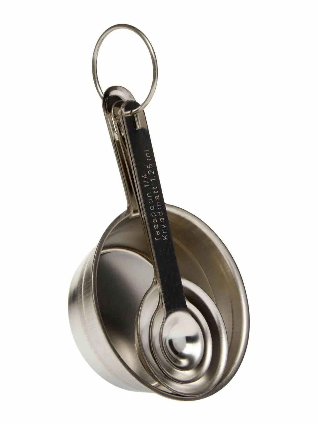 - Setti sisältää mitat: 1 dl, 15 ml, 5 ml ja 1.25 ml