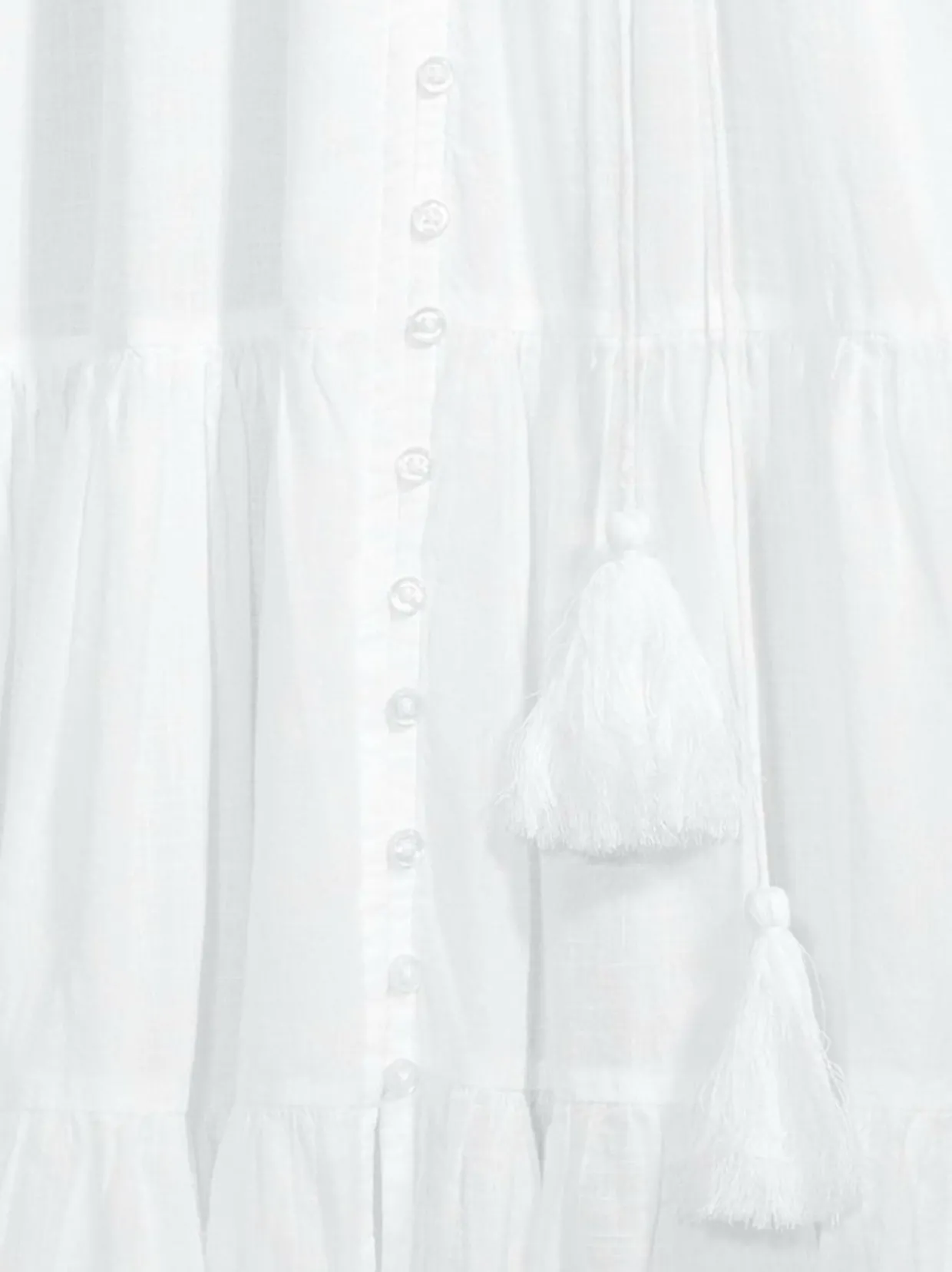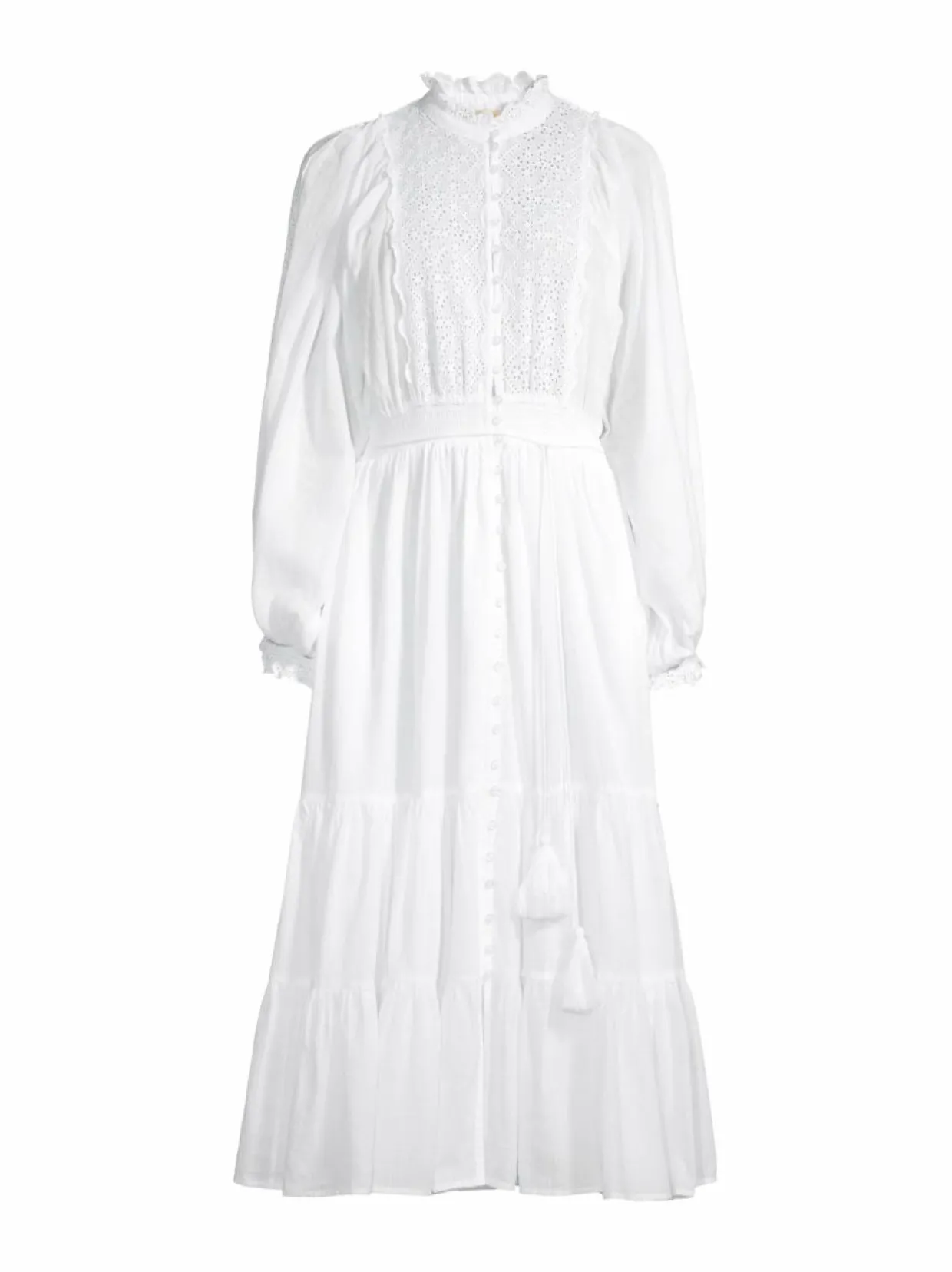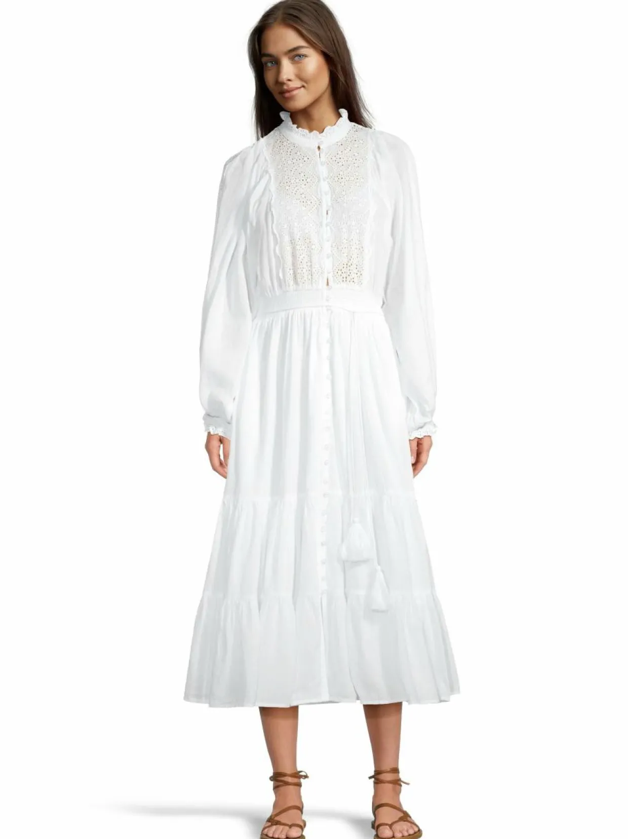 Midipituinen mekko, jossa on rento ja mukava istuvuus. Mekon materiaalina on pehmeä ja hengittävä luomupuuvilla, joka takaa miellyttävän käyttökokemuksen ja kestävyyden. Mekon laskostettu helma, tiheä kuviointi ja yläosan napitus tekevät siitä elegantin valinnan arkeen ja juhlaan.
