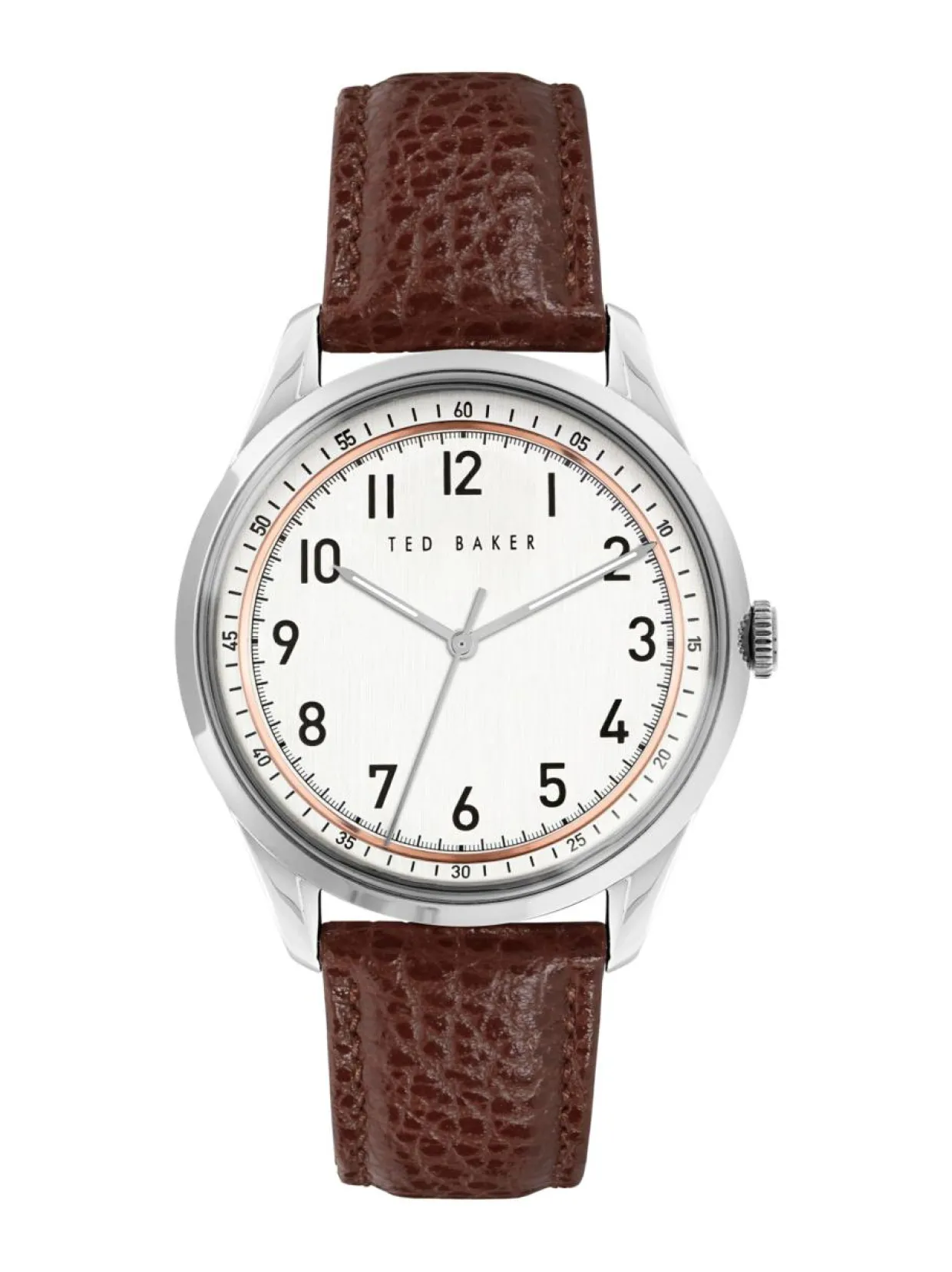 Ted Baker Daquir 40mm rannekello on varma valinta kun haluat, että myös kellon design kestää aikaa. Kellon hopeanvärinen runko on valmistettu ruostumattomasta teräksestä. Sen leveys on 40 mm ja paksuus on 11 mm. Rannekkeena tässä mallissa on ruskea nahkaranneke. Hopeanvärisen kellotaulun ympärillä on ruusukullanvärinen reunus. Kellossa on mineraalilasi ja kvartsikoneisto. Kellon vesitiiviys on 5ATM. Ted Baker kelloilla on 2 vuoden takuu.