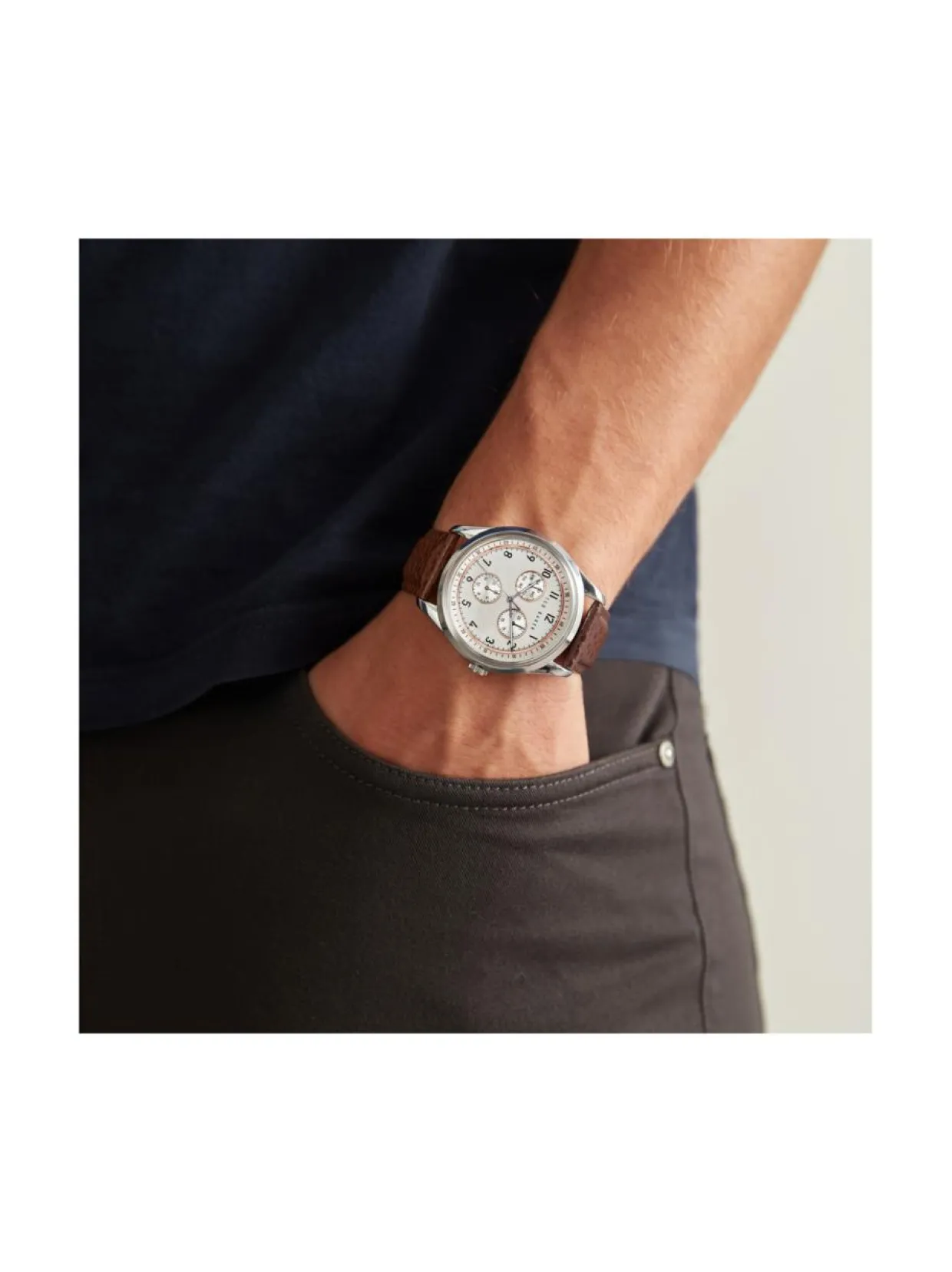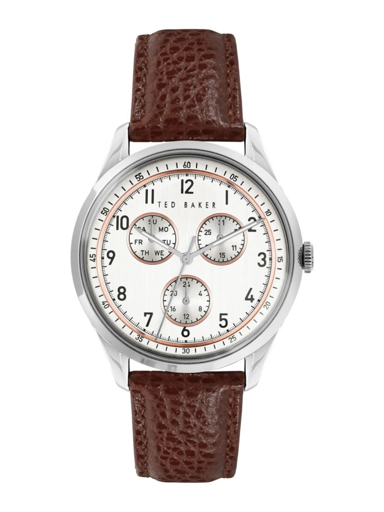 Ted Baker Daquir Multi 40mm rannekello on varma valinta kun haluat, että myös kellon design kestää aikaa. Kellon hopeanvärinen runko on valmistettu ruostumattomasta teräksestä. Sen leveys on 40 mm ja paksuus on 11 mm. Rannekkeena tässä mallissa on ruskea nahkaranneke. Valkoisessa kellotaulussa on 24 tunnin näyttö sekä pienemmät näytöt viikonpäiville ja päivämäärille. Kellotaulun näytöt on ympäröity ruusukullanvärillä. Kellossa on mineraalilasi ja kvartsikoneisto. Kellon vesitiiviys on 5ATM. Ted Baker kelloilla on 2 vuoden takuu.