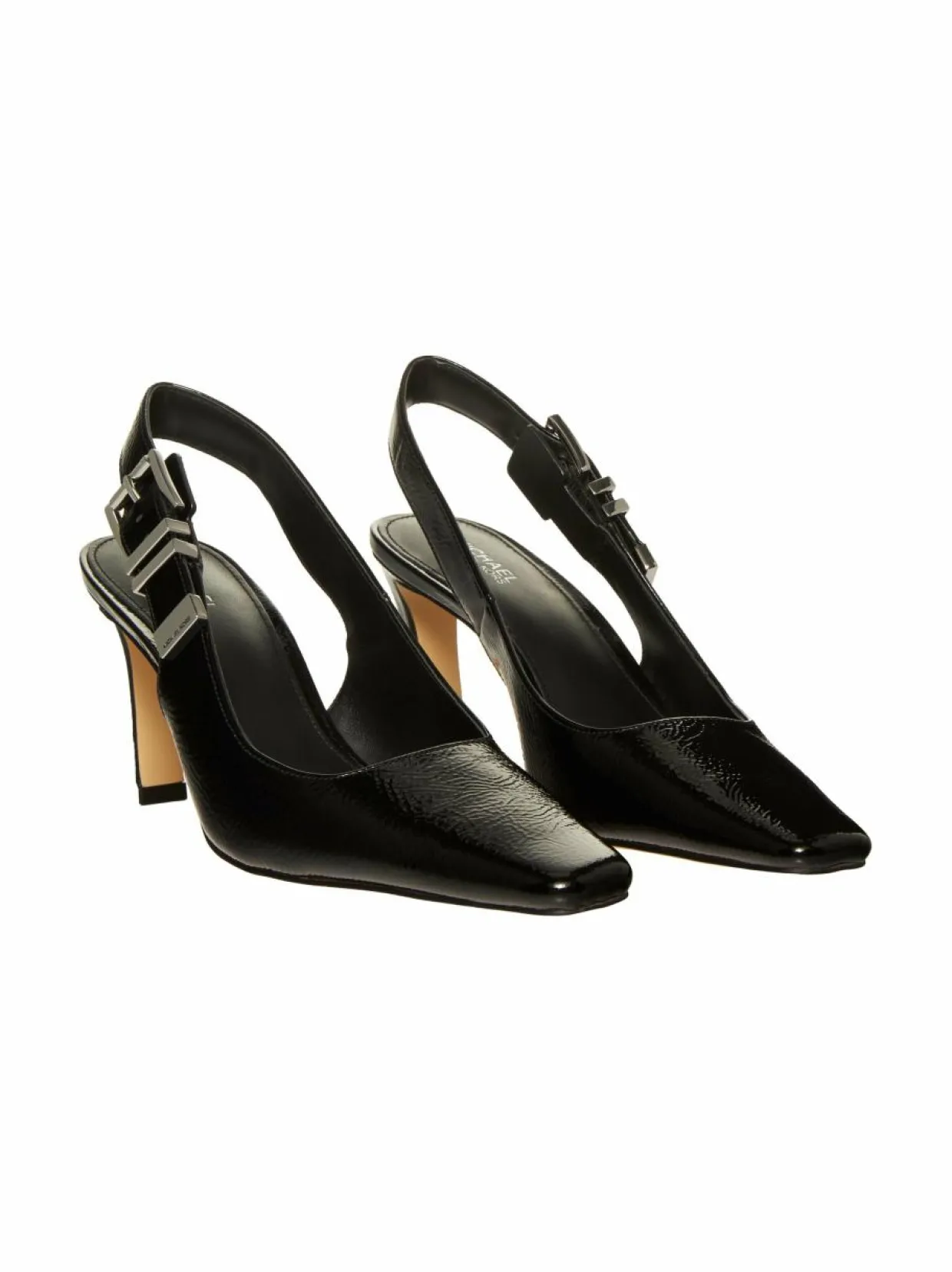 Michael Korsin Darrington Sling -nahka-avokkaat leikittelevät kulmikkailla muodoilla. Kengissä on kiiltävä nahkapäällinen ja mattanahkainen sisäpuoli. Kärjet ovat pitkät ja kulmikkaat, luoden dramaattisen ilmeen. Kiinnitetään metallisoljilla. Metalliosia koristavat brändin logotekstikaiverrukset.