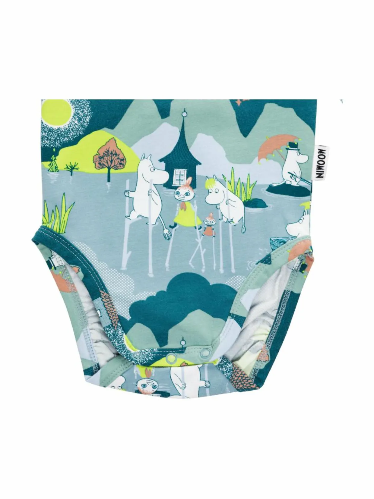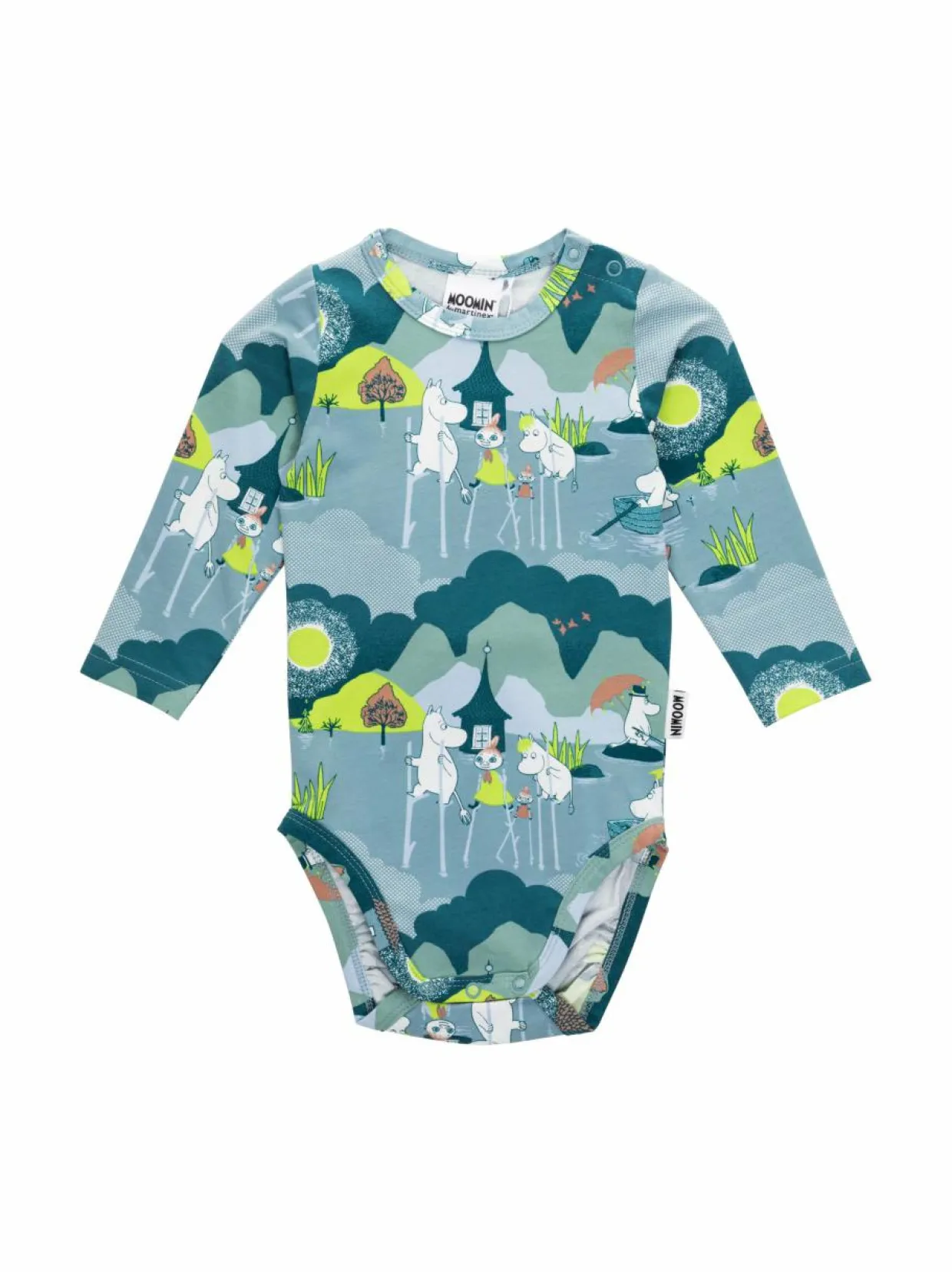 Vauvojen pitkähihainen body, jossa on nepparikiinnitys haarassa ja olkapäällä. Bodya koristaa vivahteikas muumikuviointi. Sivusaumassa on Moomin-merkki. Materiaali on miellyttävän pehmeää ja joustavaa luomupuuvillatrikoota.