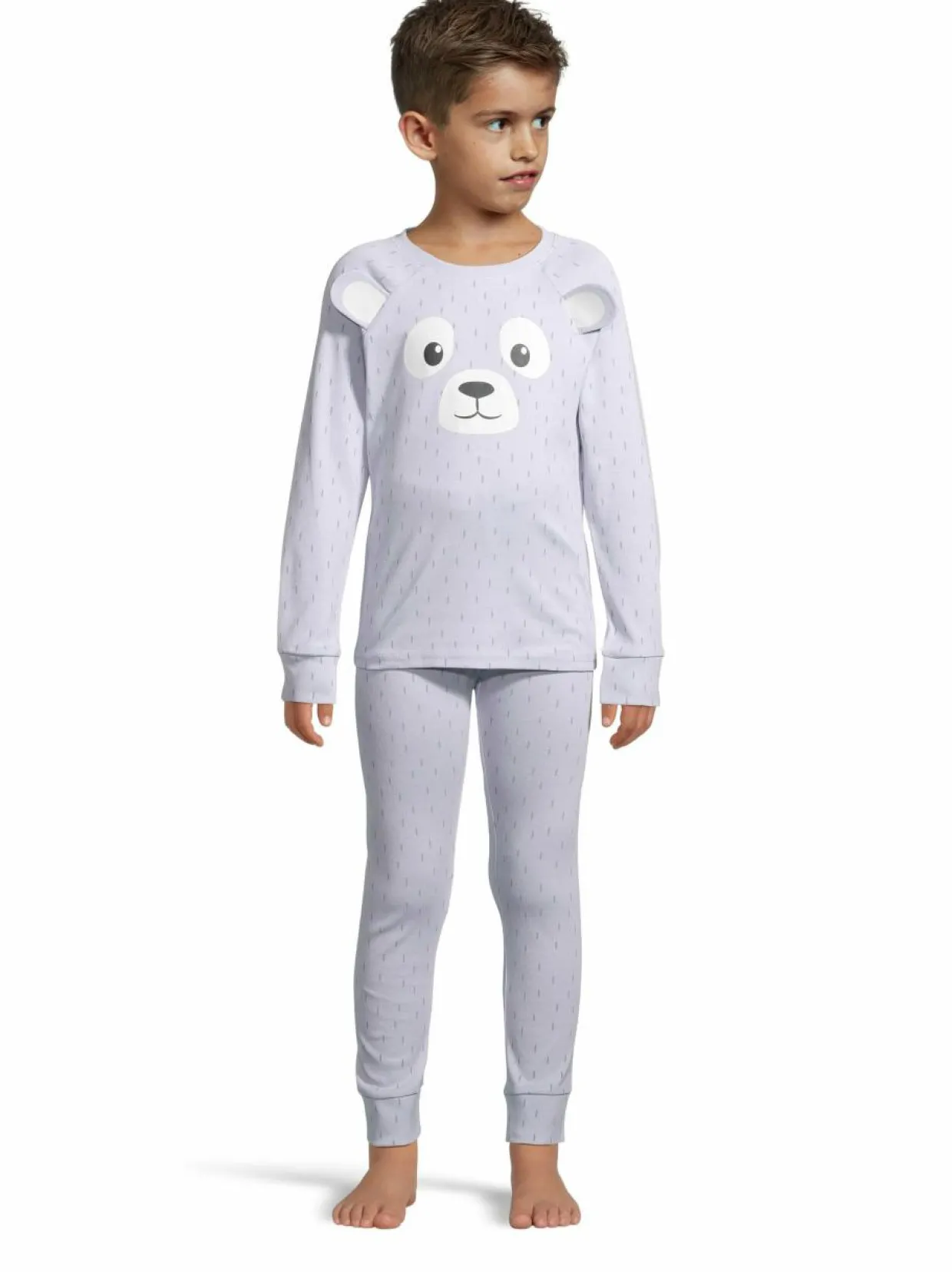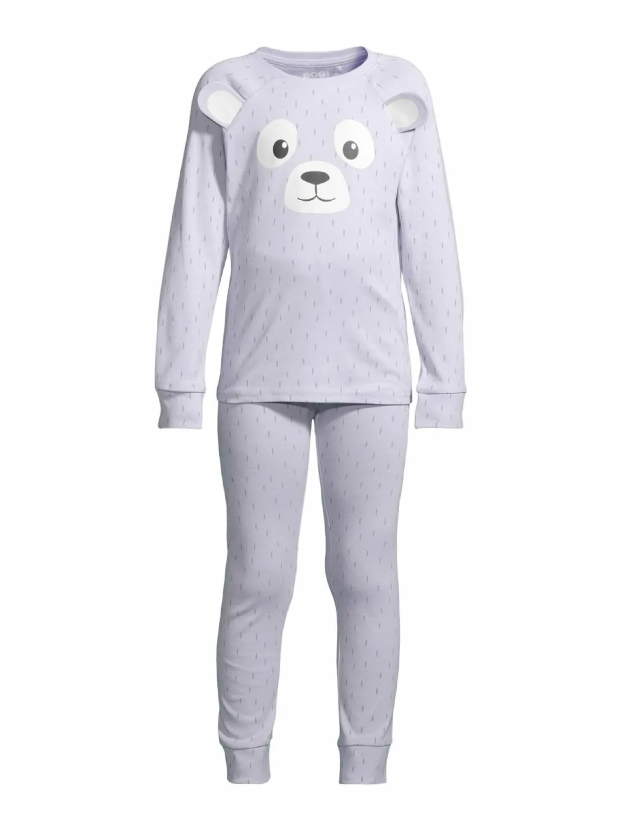 Bogin Denise on joustava pyjamasetti, johon kuuluvat housut ja paita. Molemmat on valmistettu 100 % pehmeästä luomupuuvillasta ja kuvioitu printeillä. Paidan eläinkuviota täydentävät 3D-korvat.