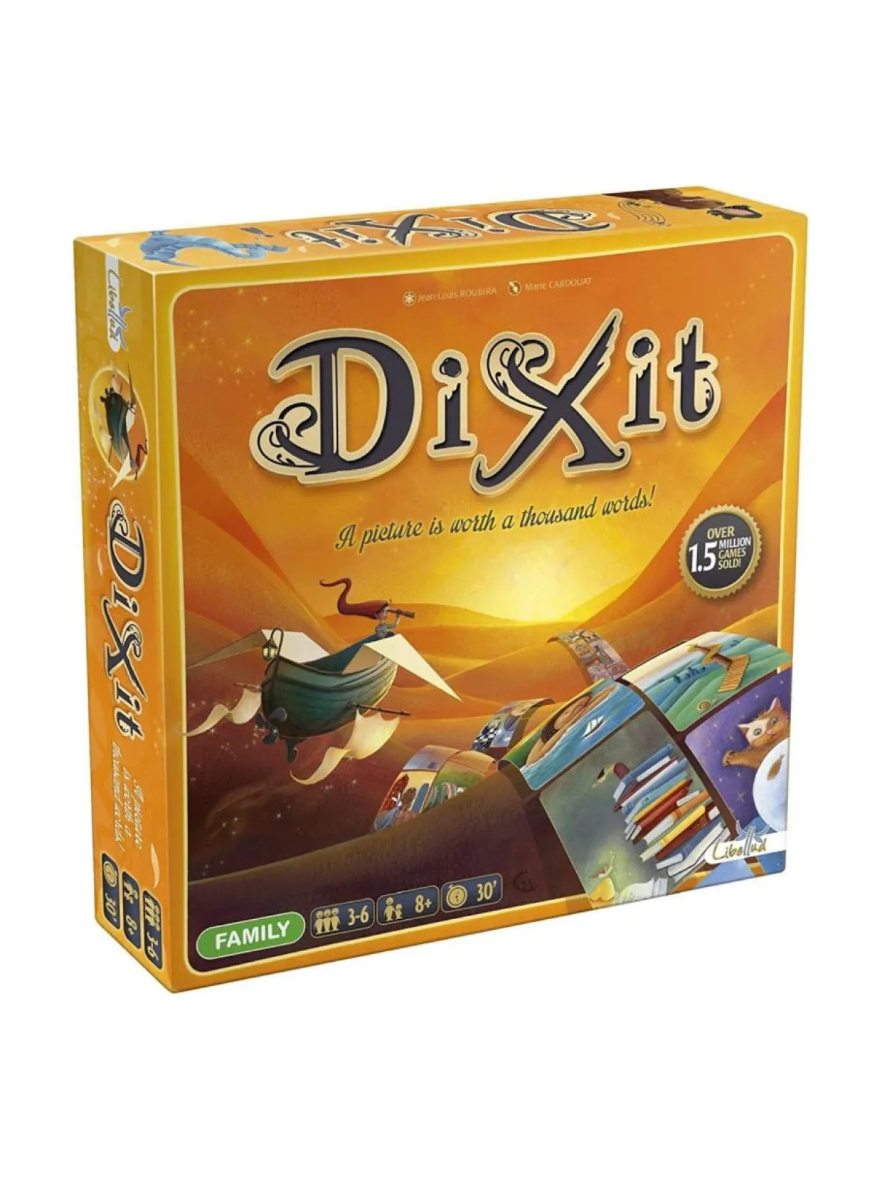 Dixit on lukuisia palkintoja maailmalla voittanut kysely- ja bluffauspeli (mm. Vuoden Peli, Spiel des Jahres). Pelaajat kysyvät vuorotellen toisiltaan arvoituksen, jonka vastaus on piilotettuna kysyjän salaa valitsemaan maalaukseen. Oikean kuvan poimiminen ei ole helppoa, sillä muut pelaajat yrittävät bluffata sinua väärillä kuvilla. Lennokas mielikuvitus on hyvä apu tässä koko perheelle sopivassa hauskassa seurapelissä! 84 korttia, pelilauta, 6 puista jänistä, äänestysmerkkiä, ohjekirja.