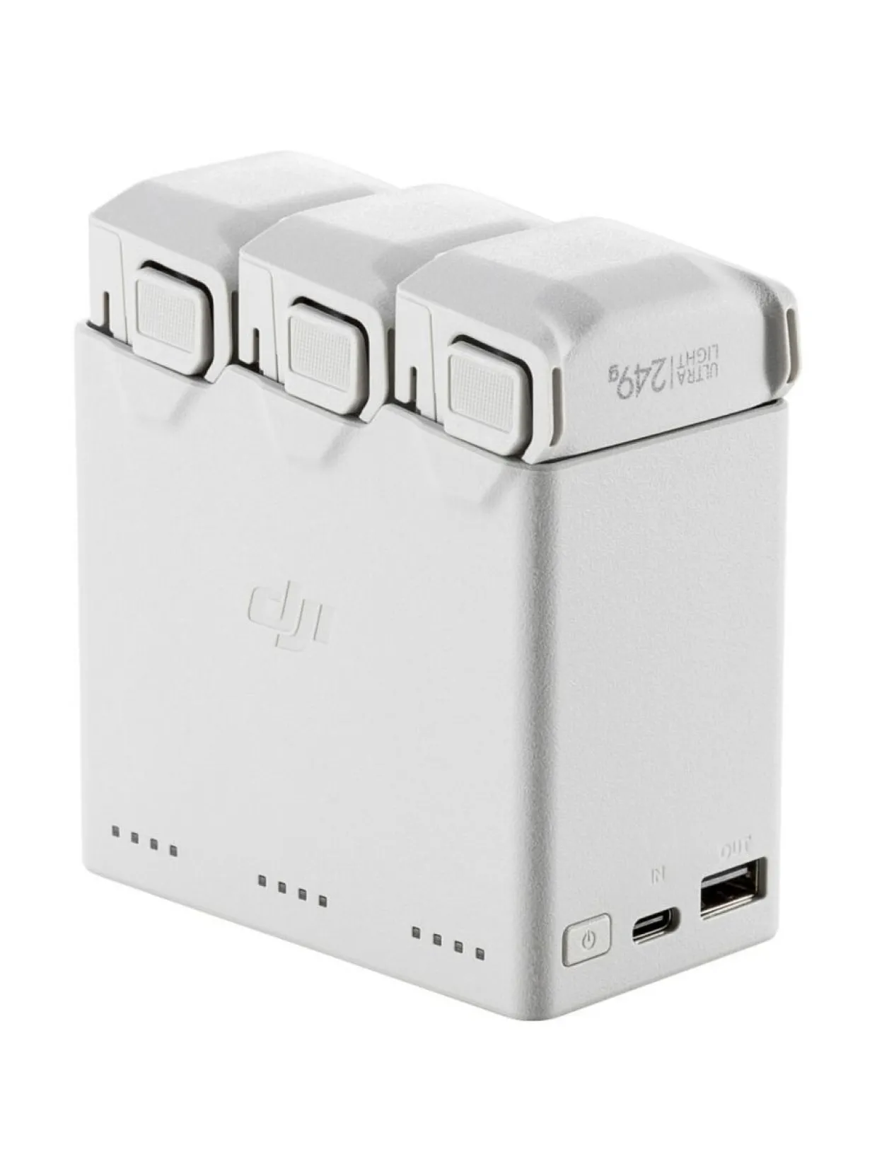 Lataushubi lataa akut peräjälkeen. Laita lataa ensimmäiseksi sen akun, jossa on vähiten ladattavaa eli mikä latautuu nopeiten. Kun kyseinen akku on ladattu, vuoroon tulee seuraava akku. Kaikkien kolmen akun lataukseen menee aikaa noin 180 minuuttia eli 3 tuntia DJI 30W USB-C Charger laturilla.