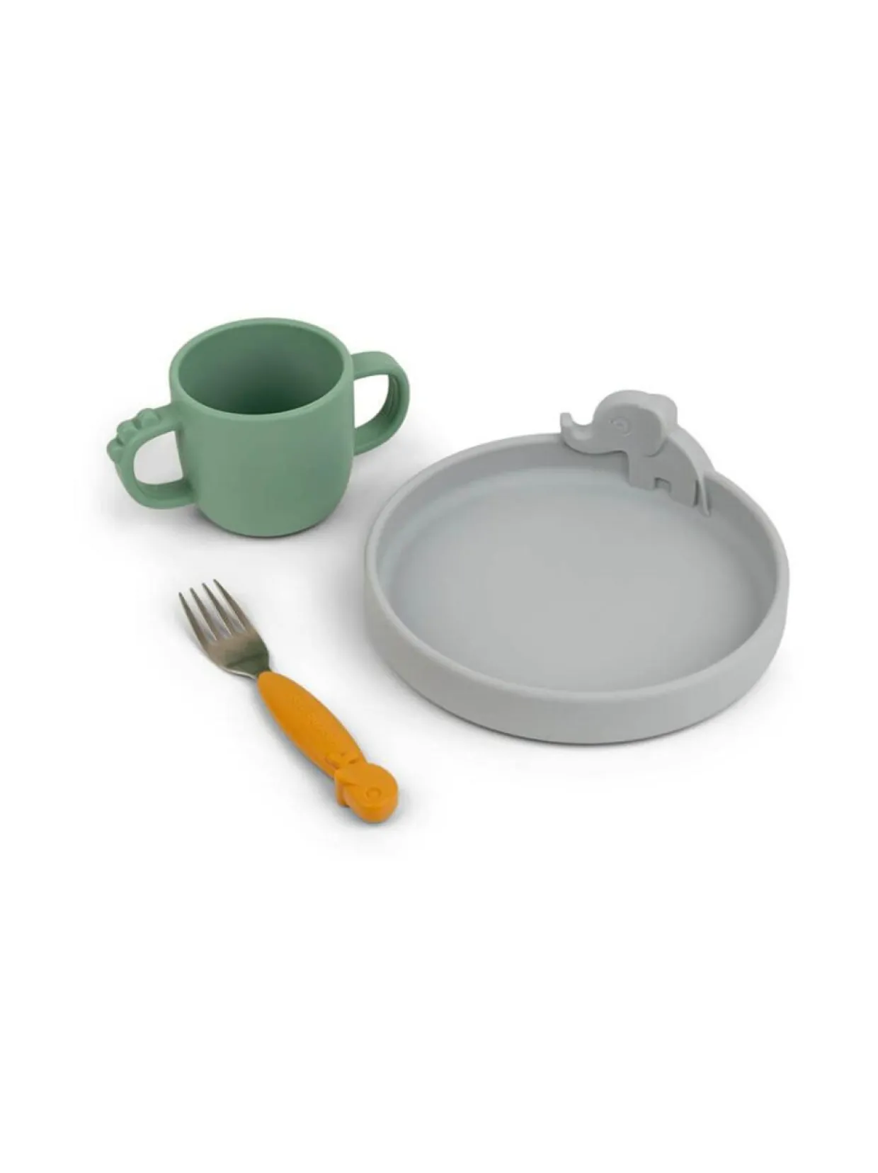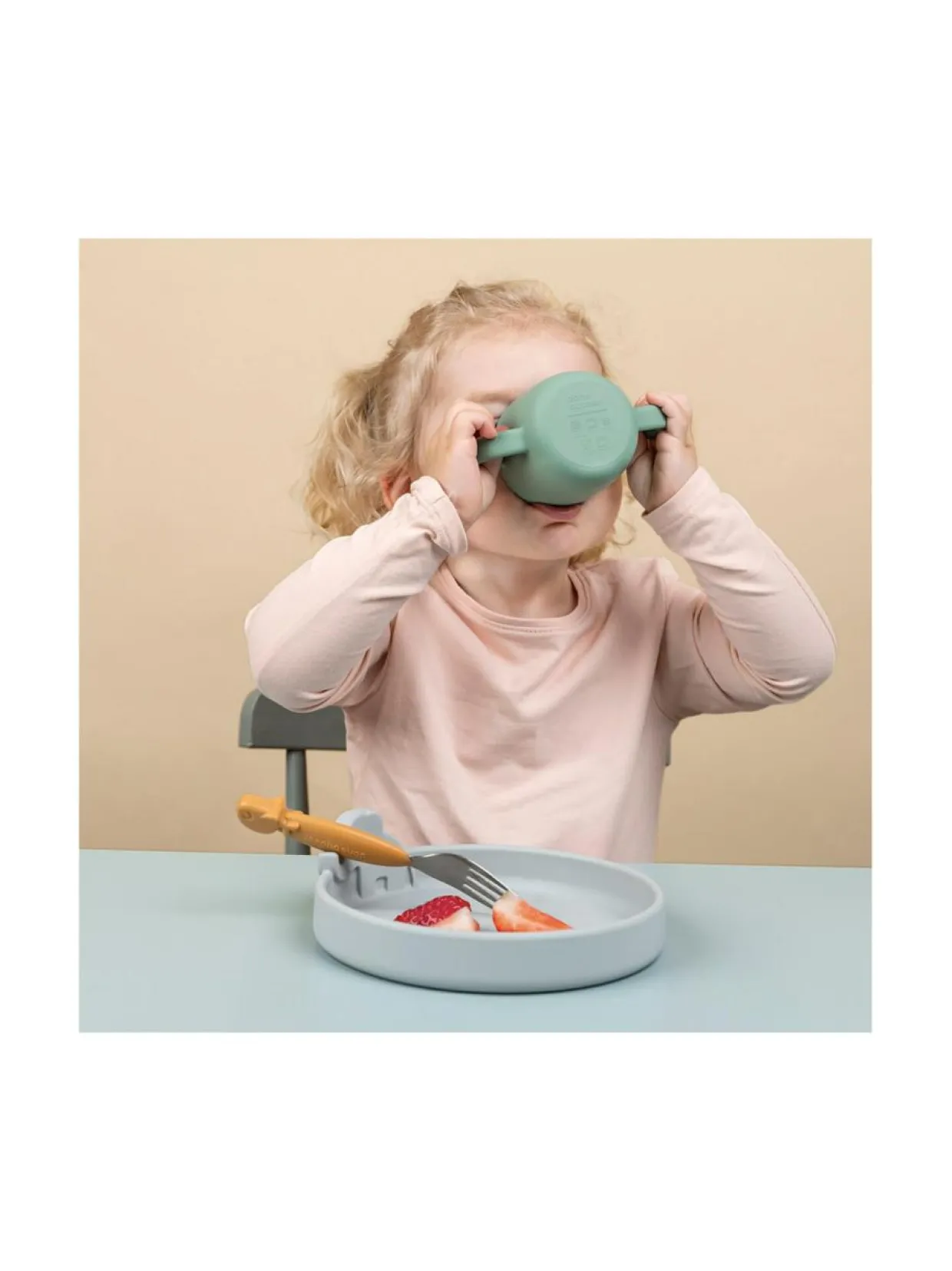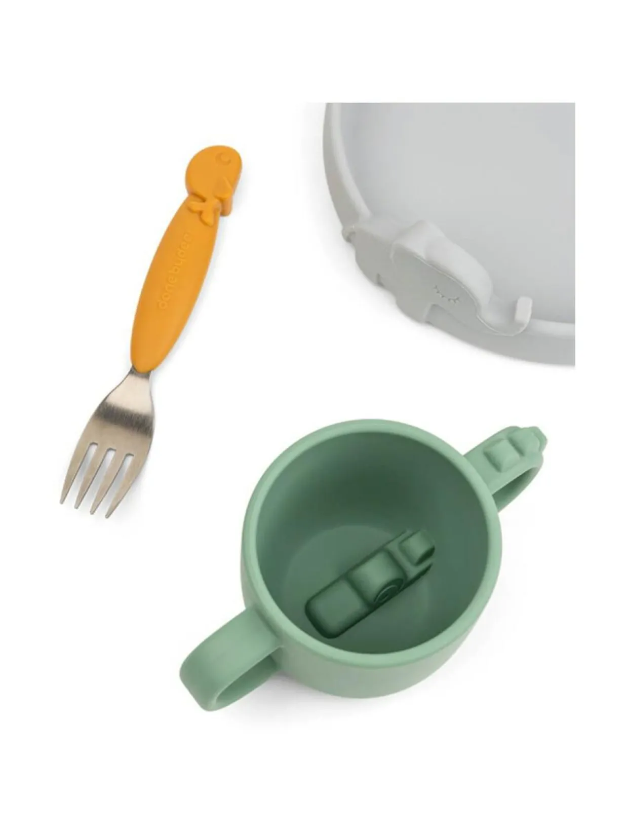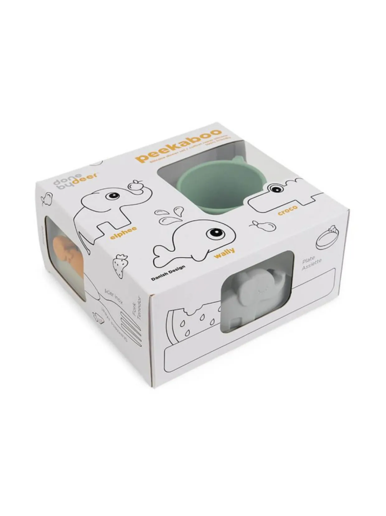 Done by Deer Peekaboo ruokailusetti on monipuolinen lasten ruokailusetti, joka sisältää kaksikahvaisen mukin, lautasen sekä haarukan. Muki ja lautanen on valmistettu elintarvikelaatuisesta silikonista, jolloin ne ovat särkymättömiä ja niitä voidaan käyttää mikroaaltouunissa. Haarukassa on silikoninen varsi ja metalliset pinnat. Tuotteiden materiaali luo myös kitkaa, jotta ne eivät liu’u niin helposti pöydällä.