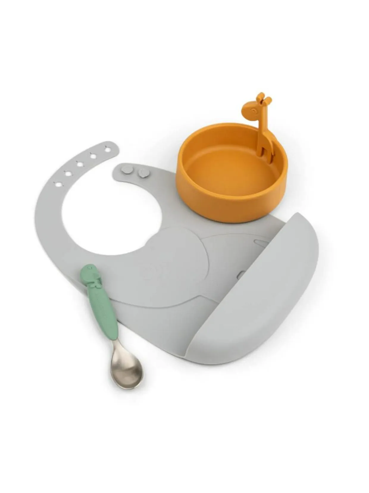 Done by Deer Peekaboo ruokailusetti sisältää suloisen kirahvi kulhon, elefantti ruokalapun ja valas lusikan. Color Mix -setissä on käytetty tuotteissa toisistaan poikkeavia värejä. Silikonista valmistetut tuotteet kestävät mahdollista tippumista, antavat kitkaa ja kulhon voi laittaa kätevästi mikroon lämmittämään ruokaa.