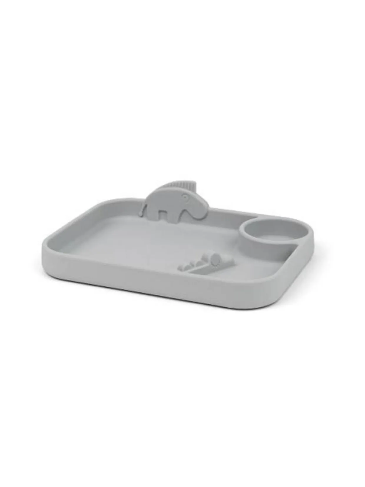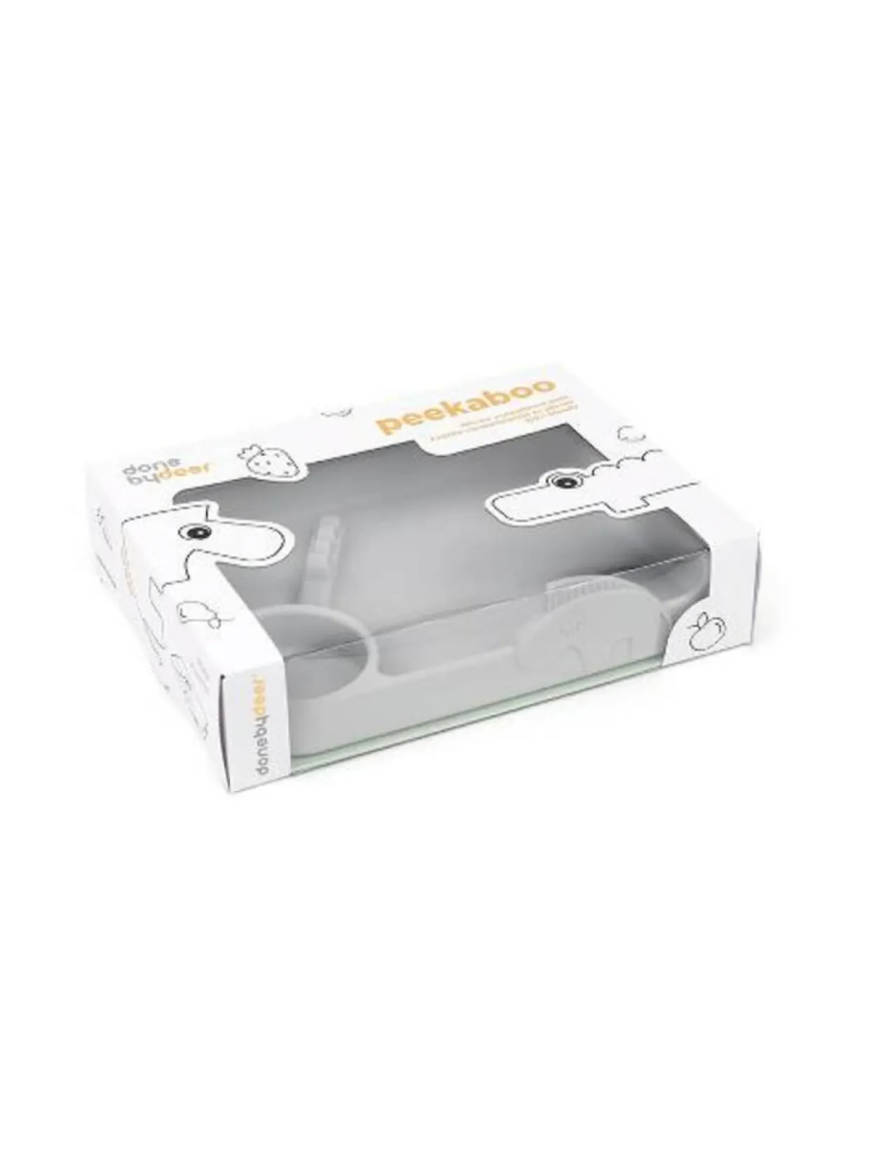 Done by Deer silikoninen lautanen Peekaboo on suorakaiteen muotoinen lautanen lapsen ruokailuhetkiin. Lautasessa on hauska seepra sekä suloinen krokotiili, ilahduttamassa pientä ruokailijaa. Silikoni on materiaalina kestävä ja sen saa laittaa mikroon, uuniin tai pakastimeen sekä pestä astianpesukoneessa. Silikoninen materiaali pitää lautasen paikoillaan tasaisella pöydällä, jotta lapsi ei saa liikutettua sitä niin helposti.