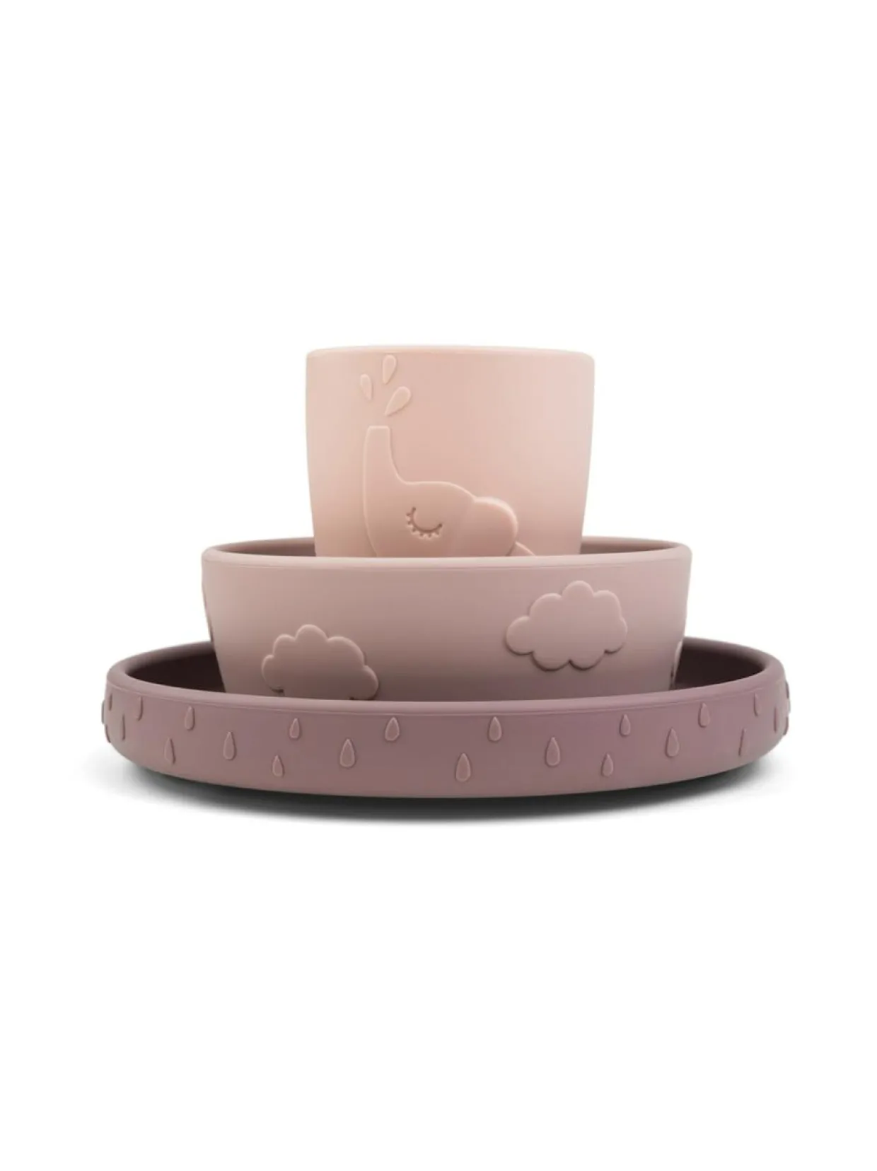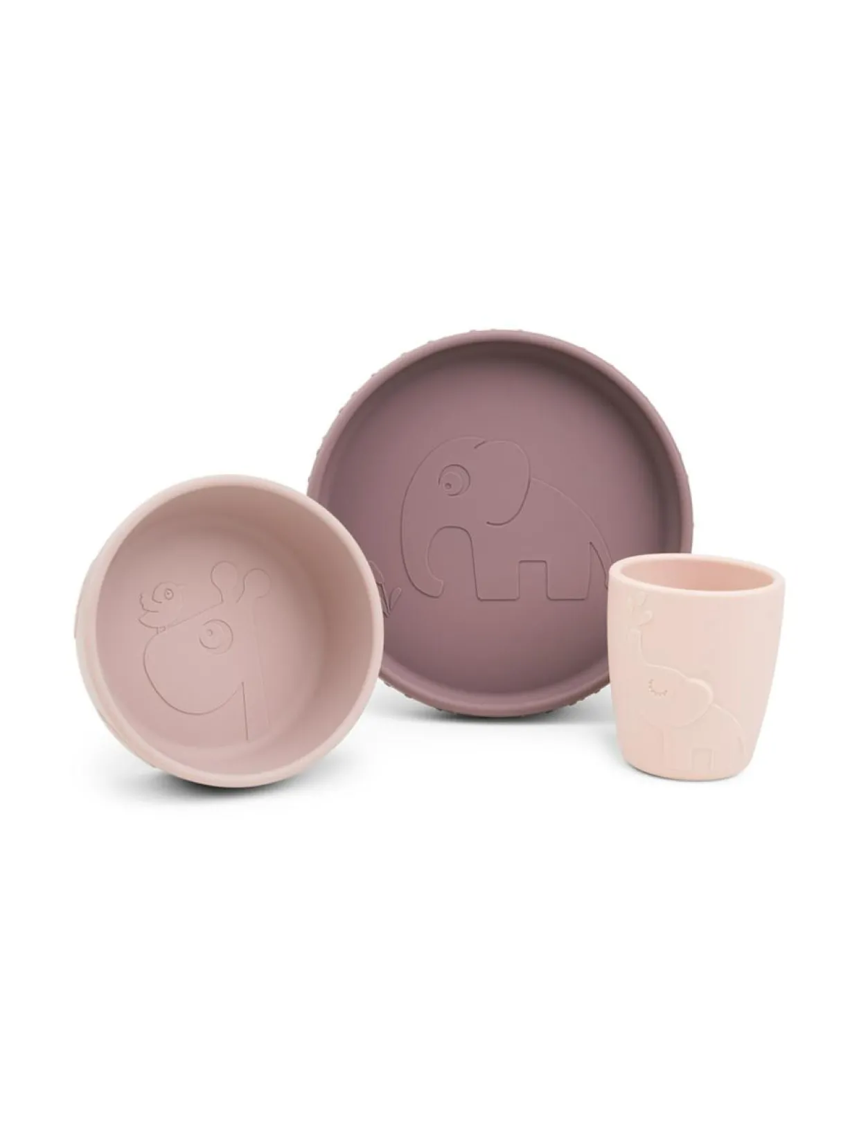Done by Deer Stick&Stay Deer friends powder ruokailusetti on monipuolinen lasten ruokailusetti, joka sisältää syvän lautasen, kulhon sekä mukin. Sekä lautasen että kulhon pohjassa on imukuppi, joka saa ne pysymään paikallaan koko ruokailun ajan. Imukuppi estää lasta heittämästä lautasta/kulhoa lattialle. Tuotteet on valmistettu elintarvikelaatuisesta silikonista, jolloin ne ovat särkymättömiä ja niitä voidaan käyttää mikroaaltouunissa.