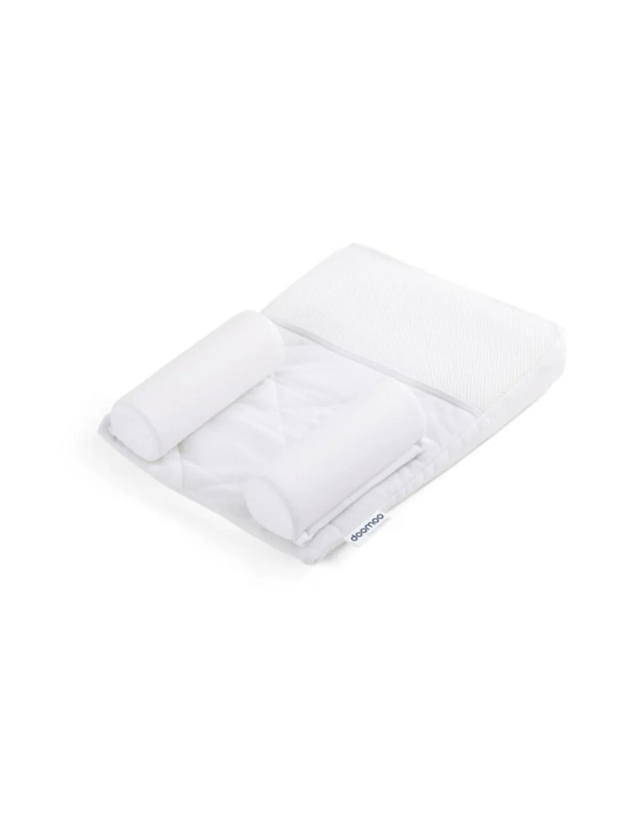 Doomoo Supreme Sleep unituki Small antaa tukea selälle ja päälle. Unituki auttaa lasta pysymään selällään nukkuessaan ja ergonominen tyyny tukee pään luonnollista kehittymistä ja estää litteäpäisyyttä. Unituki sopii myös erityisesti keskosille ja refluksioireista kärsiville vauvoille. Unitukea voi alkaa käyttämään vastasyntyneestä lähtien. Unituen säädettävät sivurullat tarjoavat tukea ja pitävät vauvan turvallisesti selinmakuulla. Unituki sopii kehtoihin ja vaunuihin, ja se on yhteensopiva Doomoo Rest Easy korotustyynyn kanssa.