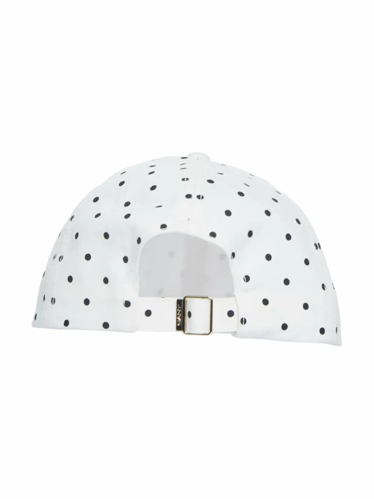 Tämä lippis on valmistettu pehmeästä puuvillatwististä, joka tuntuu miellyttävältä ihoa vasten. Sen klassinen muotoilu saa sen sopimaan monenlaiseen asuun. Pipo on koristeltu pilkuilla, jotka luovat viimeistellyn ilmeen. Säädettävä hihna takana mahdollistaa istuvuuden säätämisen.