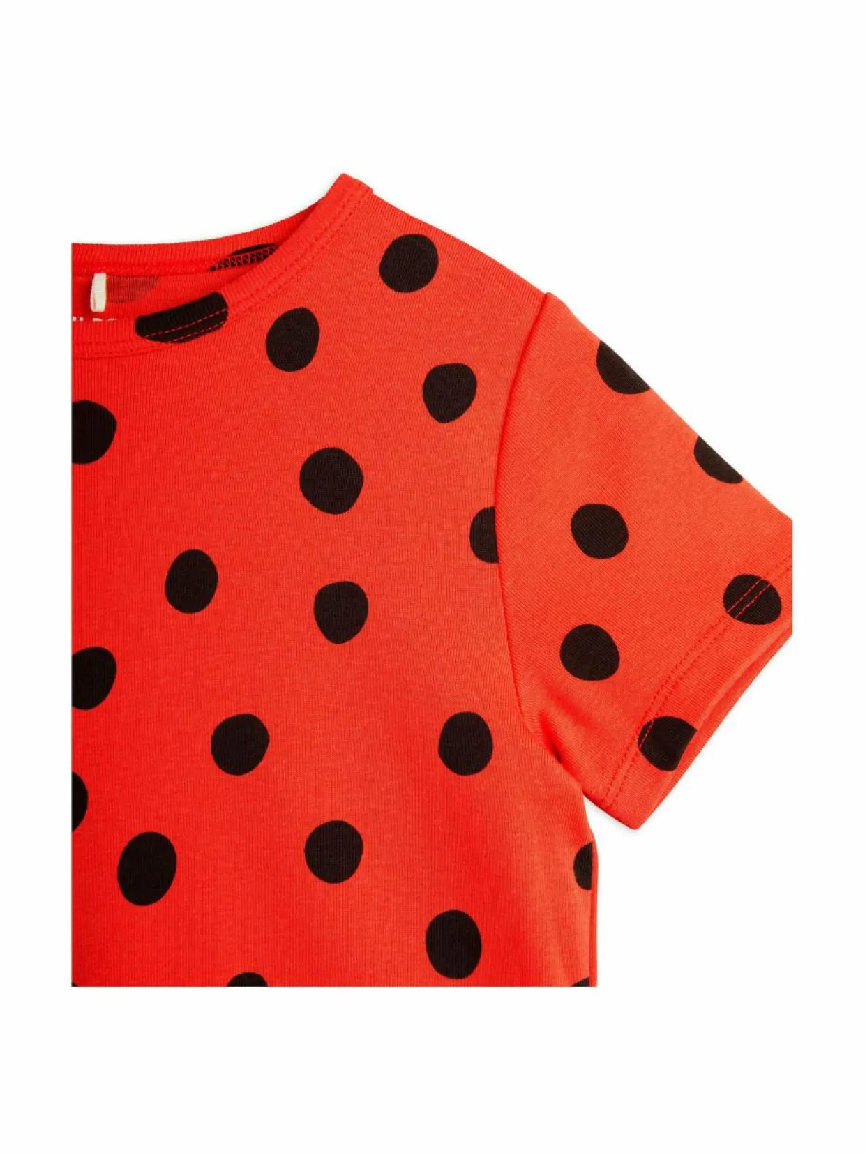 Mini Rodinin lyhythihainen trikoopaita pilkkuprintillä. Materiaali on pehmeän tuntuista ja joustavaa luomupuuvillaa.