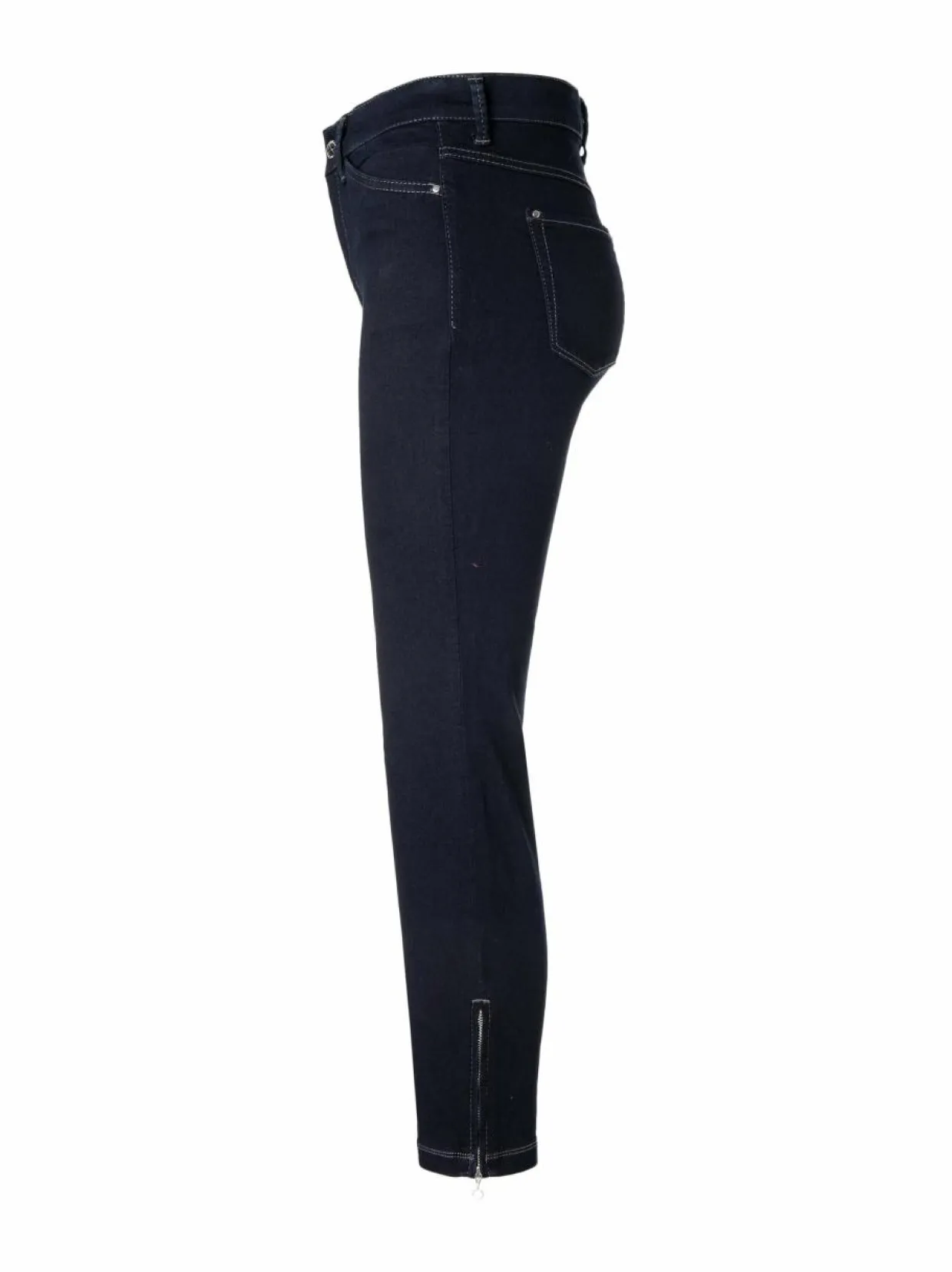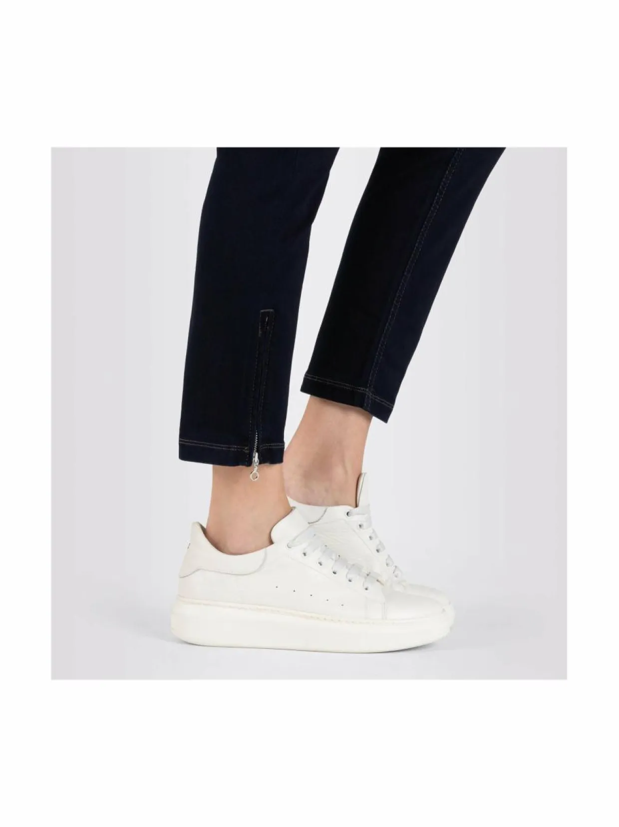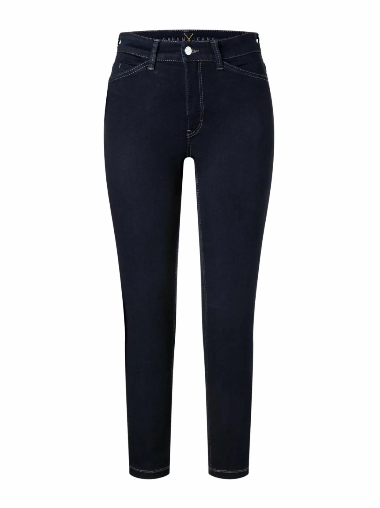 Mac Jeans merkkiset Dream Chic -farkut ovat mukavan joustavaa laatua. Niissä on viistot etutaskut ja kontrastisävyiset tikkaukset. Vyötärökaitaleelta löytyvät vyölenkit. Lahkeet ovat kapeat ja pukevat jalkoja kauniisti. Lahkeensuissa on vetoketjuhalkiot.