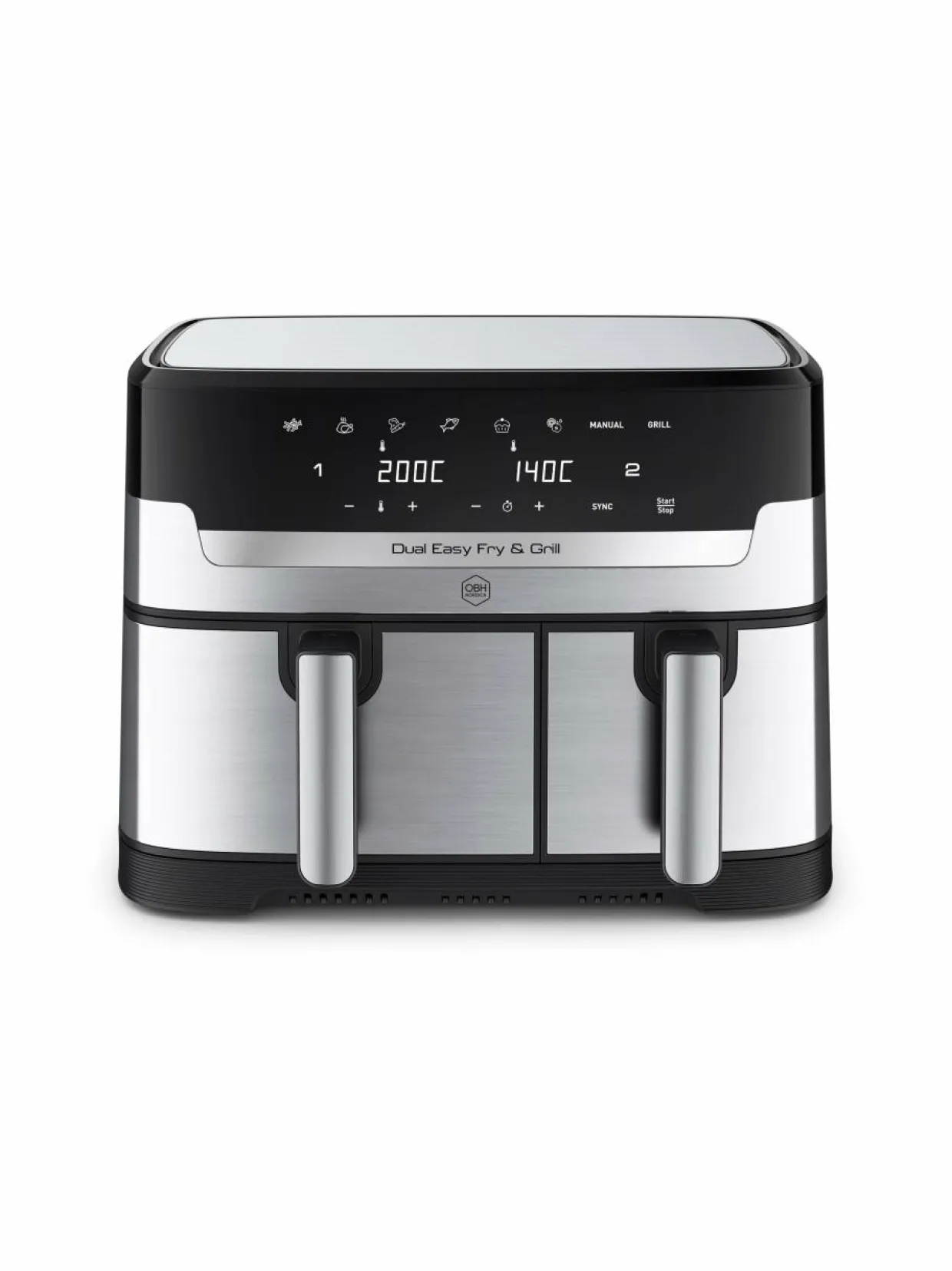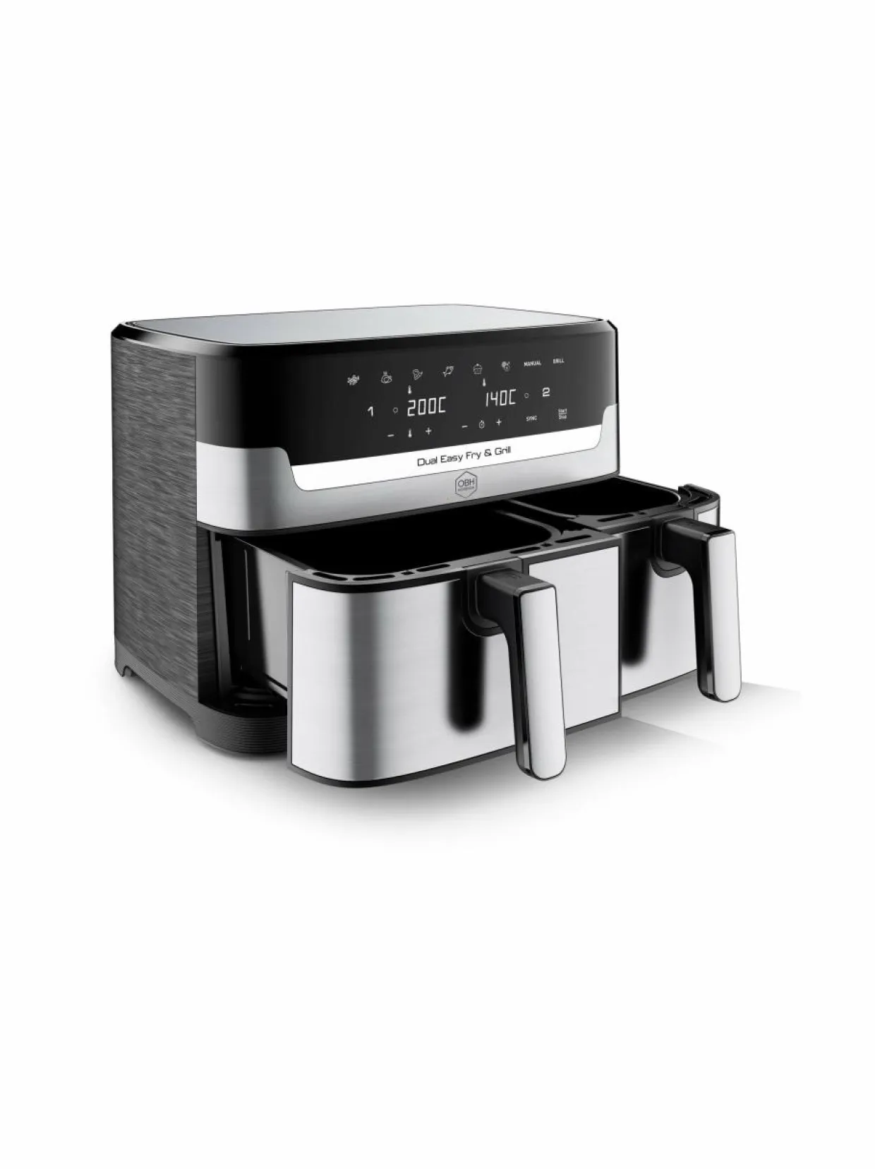 Laitteessa on kaksi erikokoista koria 5,1 litraa ja 3,2 litraa sekä synkronointitoiminto. Voit valmistaa pääruuan ja lisukkeet samanaikaisesti, eri lämpötiloissa ja ne ovat valmiita yhtäaikaa.Synkronointitoiminnon ansiosta voit käyttää yhtä aikaa molempia kypsennysastioita ja valmistaa esimerkiksi friteerattuja perunoita ja grillattua lihaa. Kummatkin ruoat ovat valmiita samalla hetkellä. 5,1 litran kypsennysastiassa on mukana tarttumattomaksi pinnoitettu grillausparila. Esilämmityksen aikana parila kuumenee erittäin kuumaksi. Kuuma grillausparila sulkee lihan lihassyyt nopeasti ja näin lihasnesteet pysyvät tallella. Parilassa on tarttumaton pinnoite. 3,2 litran astiassa on mukana tarttumattomaksi pinnoitettu ritilä. Laitteen 8,3 L:n kokonaistilavuus riittää jopa 8 annoksen valmistamiseen. Siksi se sopii mainiosti koko perheelle.