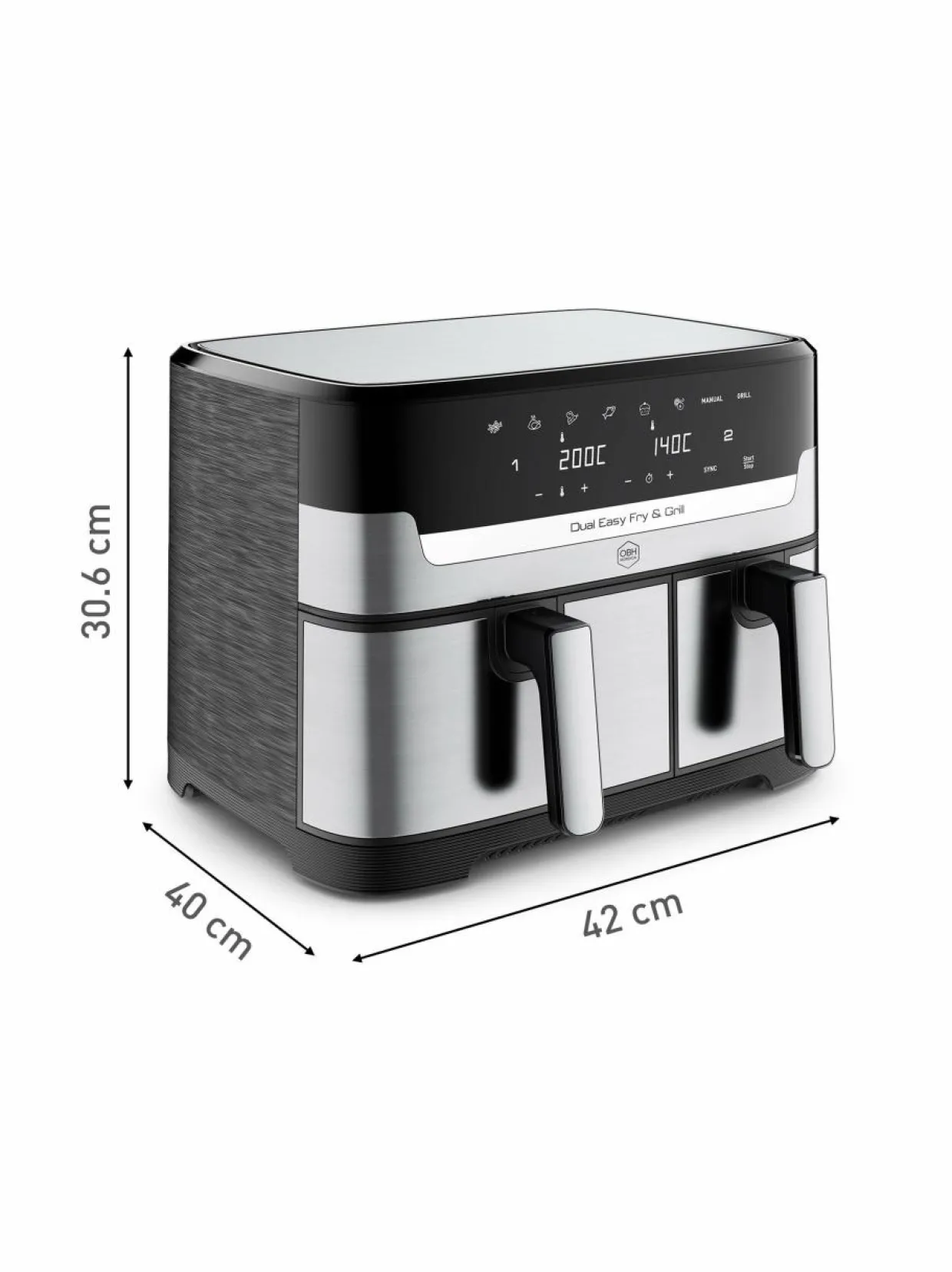 Tuotenumero168707551 Materiaaliruostomaton teräs, muovi Takuu24 kk ValmistusmaaKiina VäriSTEEL Koko30,6x40x42 CM AvainsanatOBH Nordica, kiertoilmakeitin, airfryer, keittiö, ruuan valmistus