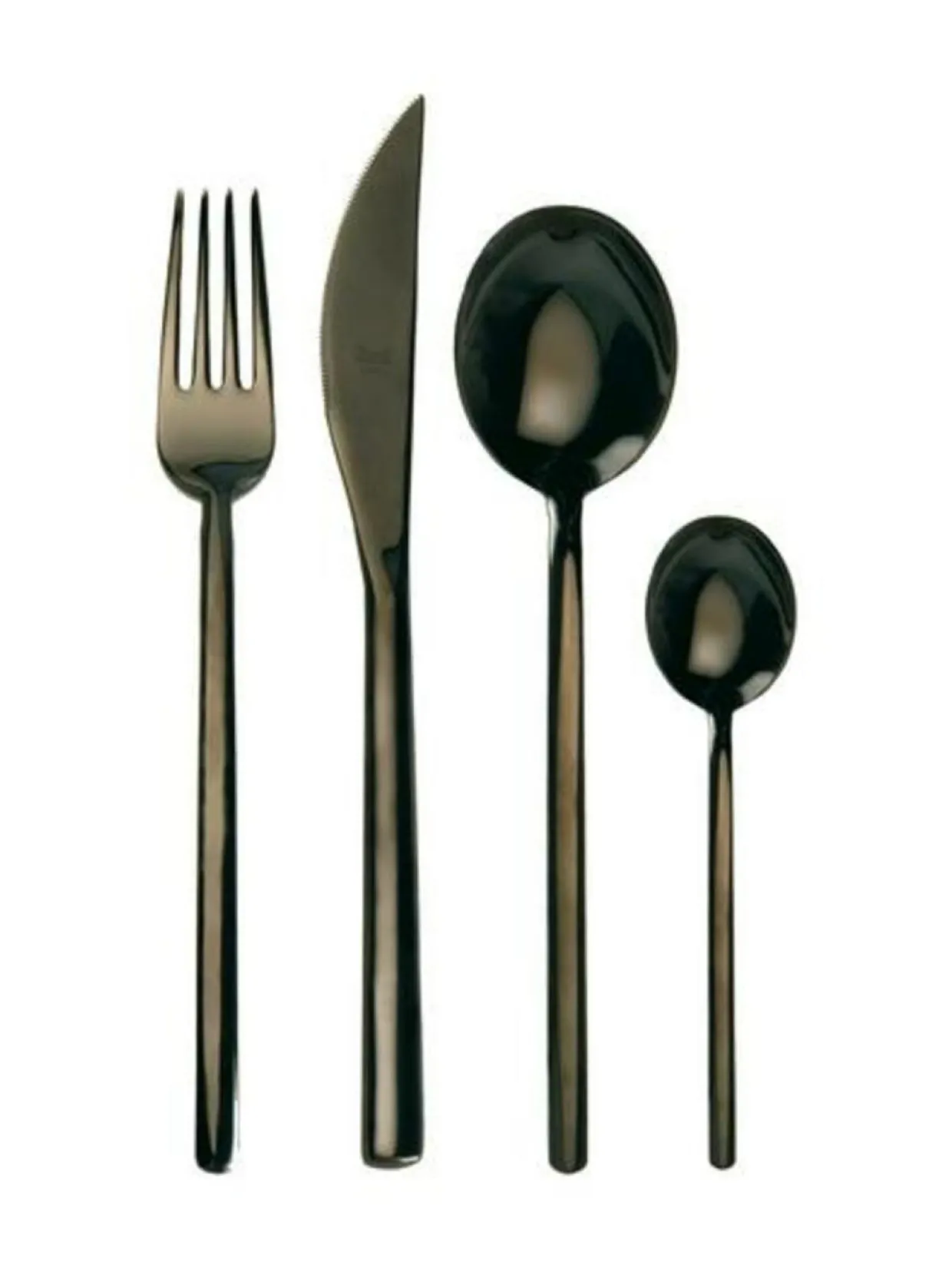 Due on oodi italialaiselle modernille designille. Sen muotoilu lähenee täydellisyyttä eikä se kyllästytä koskaan! Musta Due Oro Nero aterinsetti sisältää kuusi ruokahaarukkaa, kuusi ruokaveistä, kuusi ruokalusikkaa ja kuusi kahvilusikkaa. Materiaali on korkealaatuista suomalaista konepesunkestävää ruostumatonta terästä.