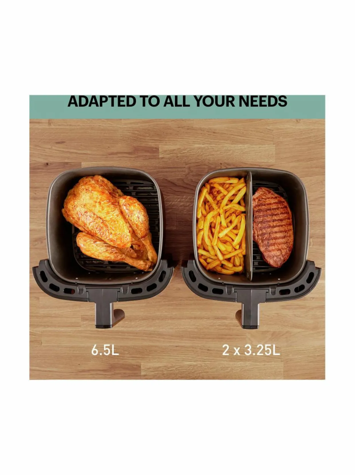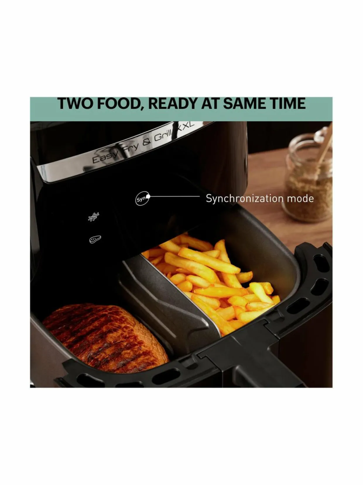Easy Fry & Grill XXL:n innovatiivisen tekniikan ansiosta voit käyttää yhtä aikaa kahta eri ohjelmaa ja valmistaa esimerkiksi friteerattuja perunoita ja grillattua lihaa. Laite huolehtii automaattisesti, että molemmat ruokalajit valmistuvat samanaikaisesti täydellisin tuloksin.