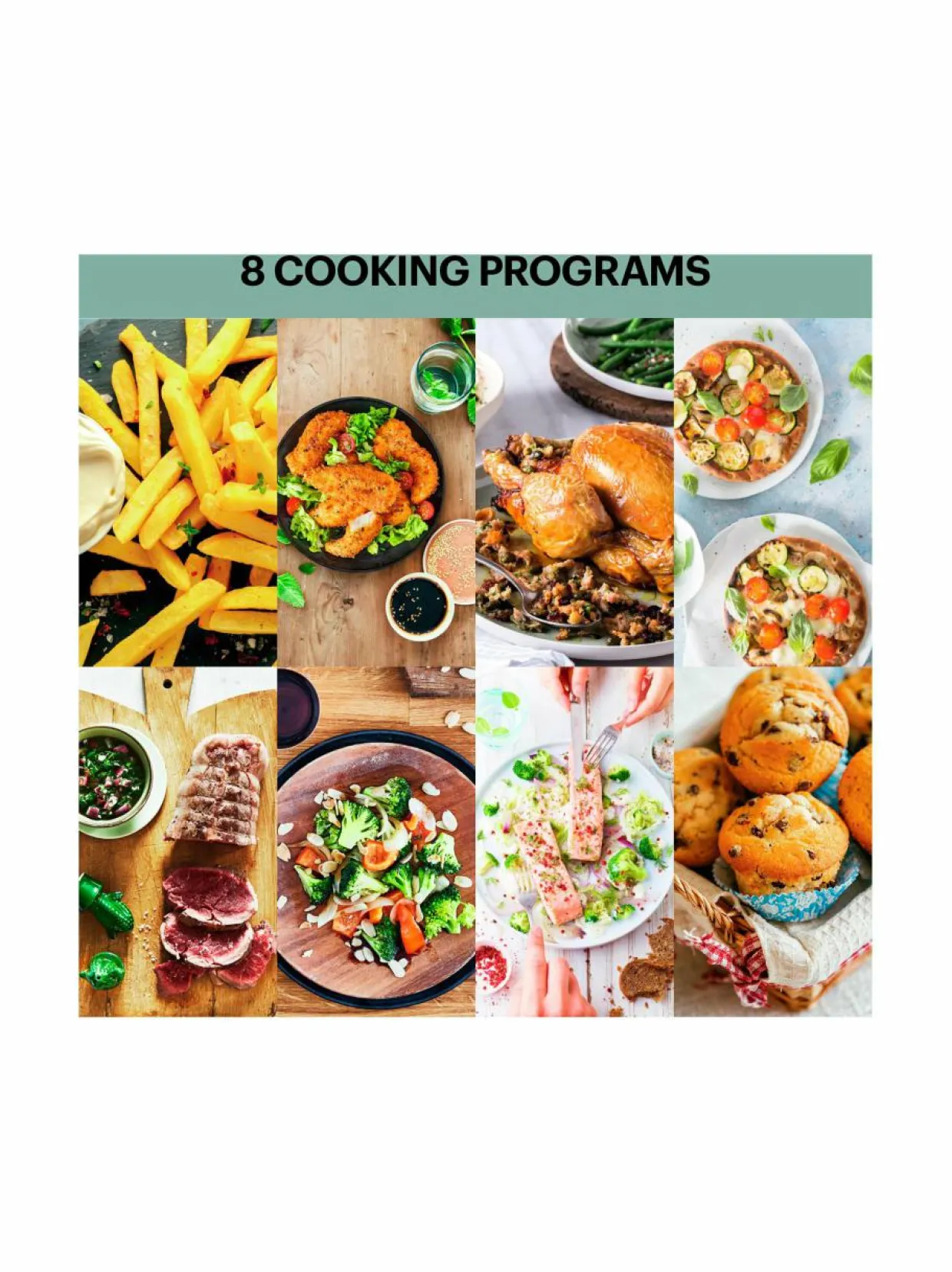 Laitteessa on irrotettava kypsennystilan jakaja, joten voit valmistaa kokonaisen broilerin käyttämällä koko aluetta tai kahta erilaista ruokalajia käyttämällä jakajaa. 8 automaattiohjelmaa – kokonainen broileri, ranskalaiset perunat, liha, kala, kana, pizza, vihannekset ja jälkiruoat. Voit myös leipoa mehukkaita suklaamuffinsseja sekä käyttää kuivausohjelmaa. Pakkauksessa laitteen mukana tuleva vankkatekoinen grillausparila ja korkea 220 asteen lämpötila takaavat täydellisen grillaustuloksen.