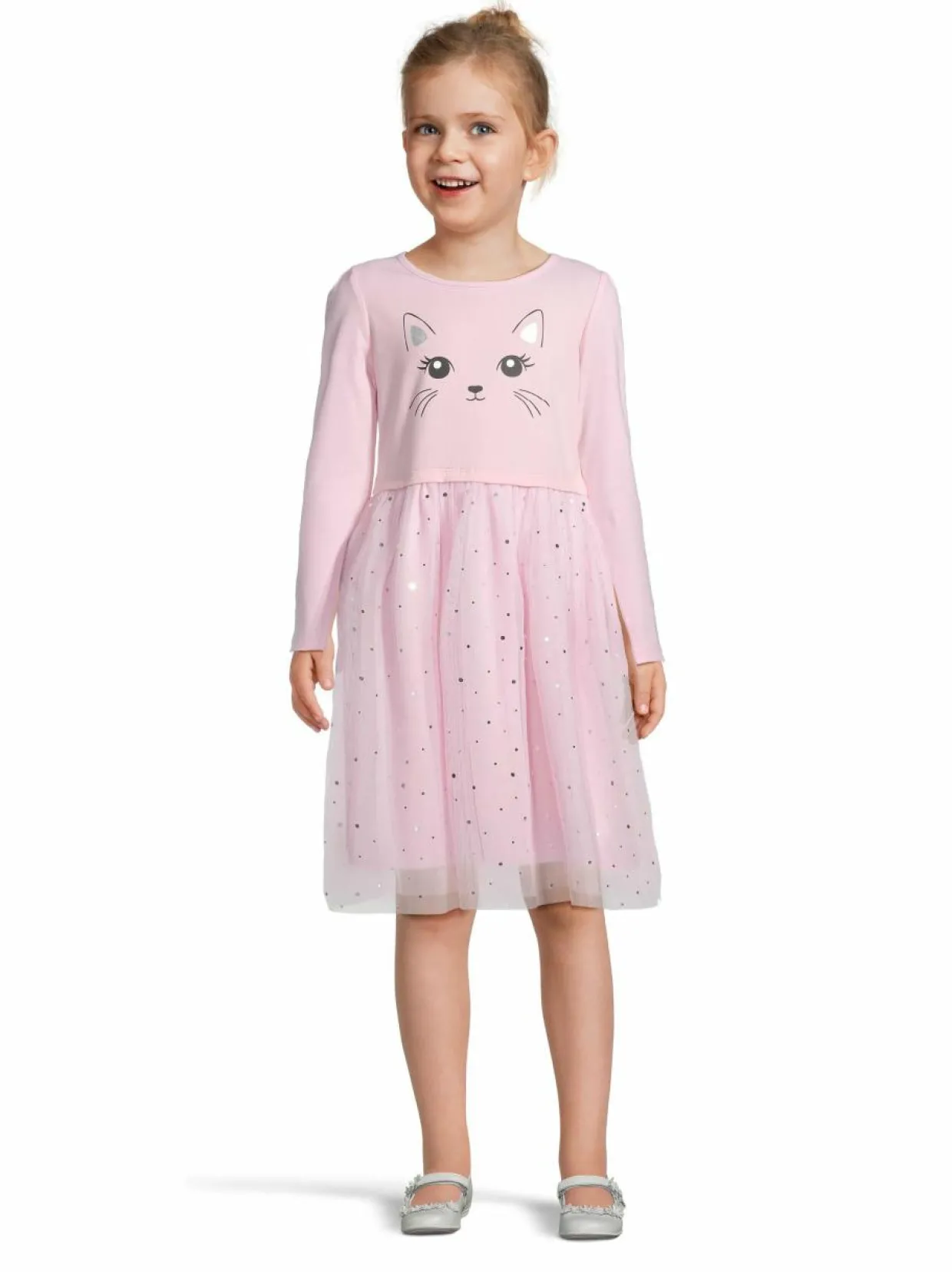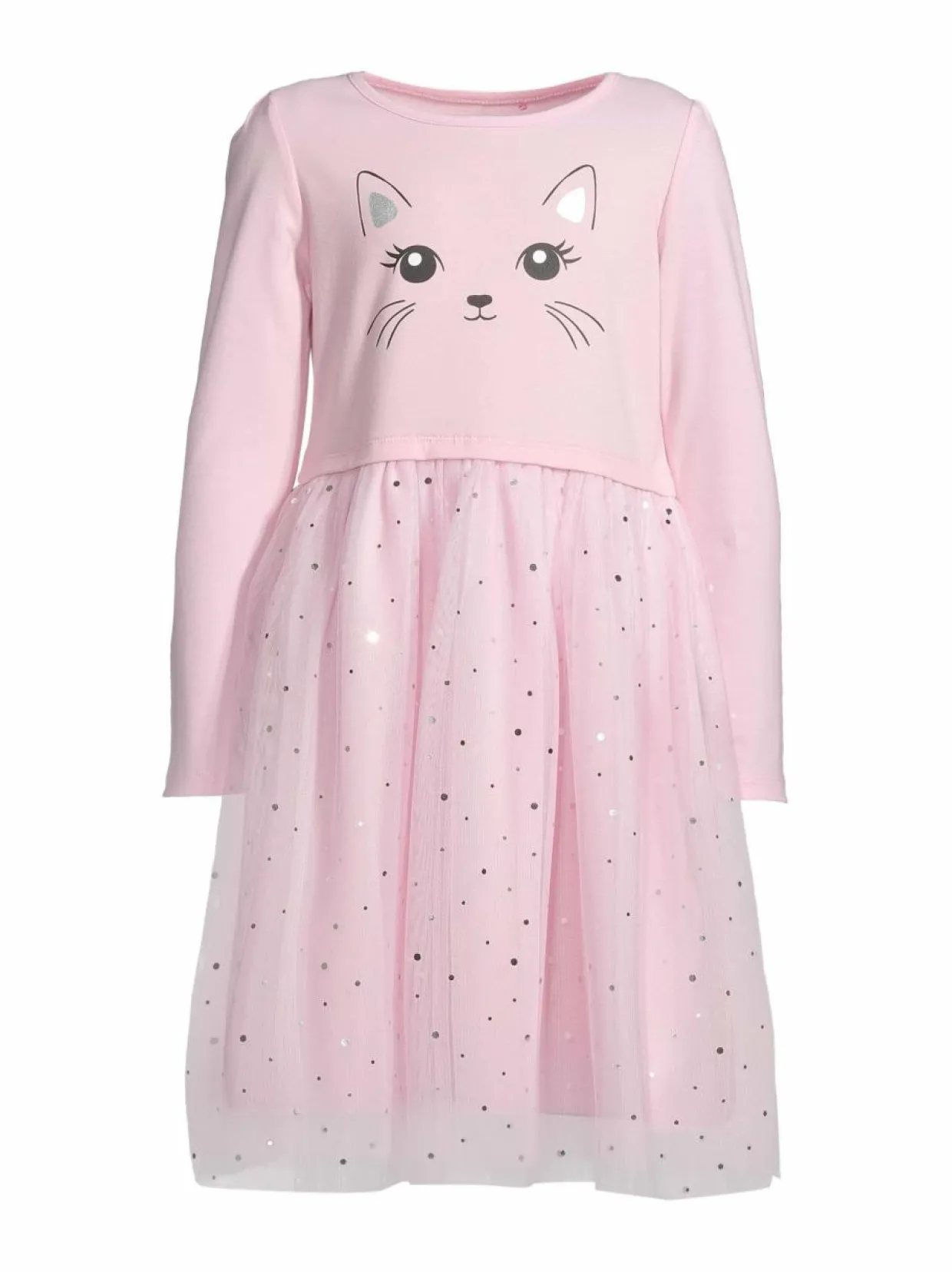 Upea Elaine-mekko on valmistettu pehmeästä jerseystä ja siinä on kerrostettu, kiiltävillä paljeteilla koristeltu tyllihelma. Mekko on mukava ja helppo pukea päälle. Sen yläosaa koristaa kissakuvio. Se sopii täydellisesti juhliin ja erilaisiin tilaisuuksiin.