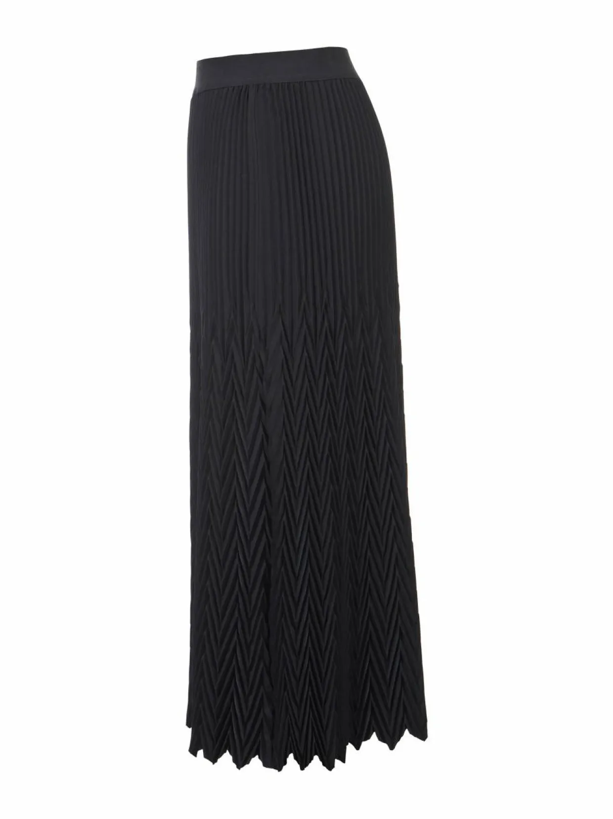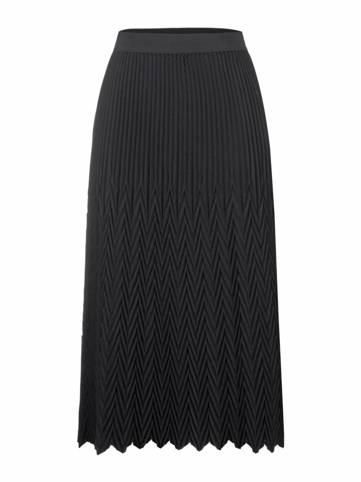 Pohjepituinen, pliseerattu hame, jossa on kaunis kalanruotokuviointi. Hameessa on käytössä mukava, joustava kuminauhavyötärö. Takapituus on 84 cm koossa 36.