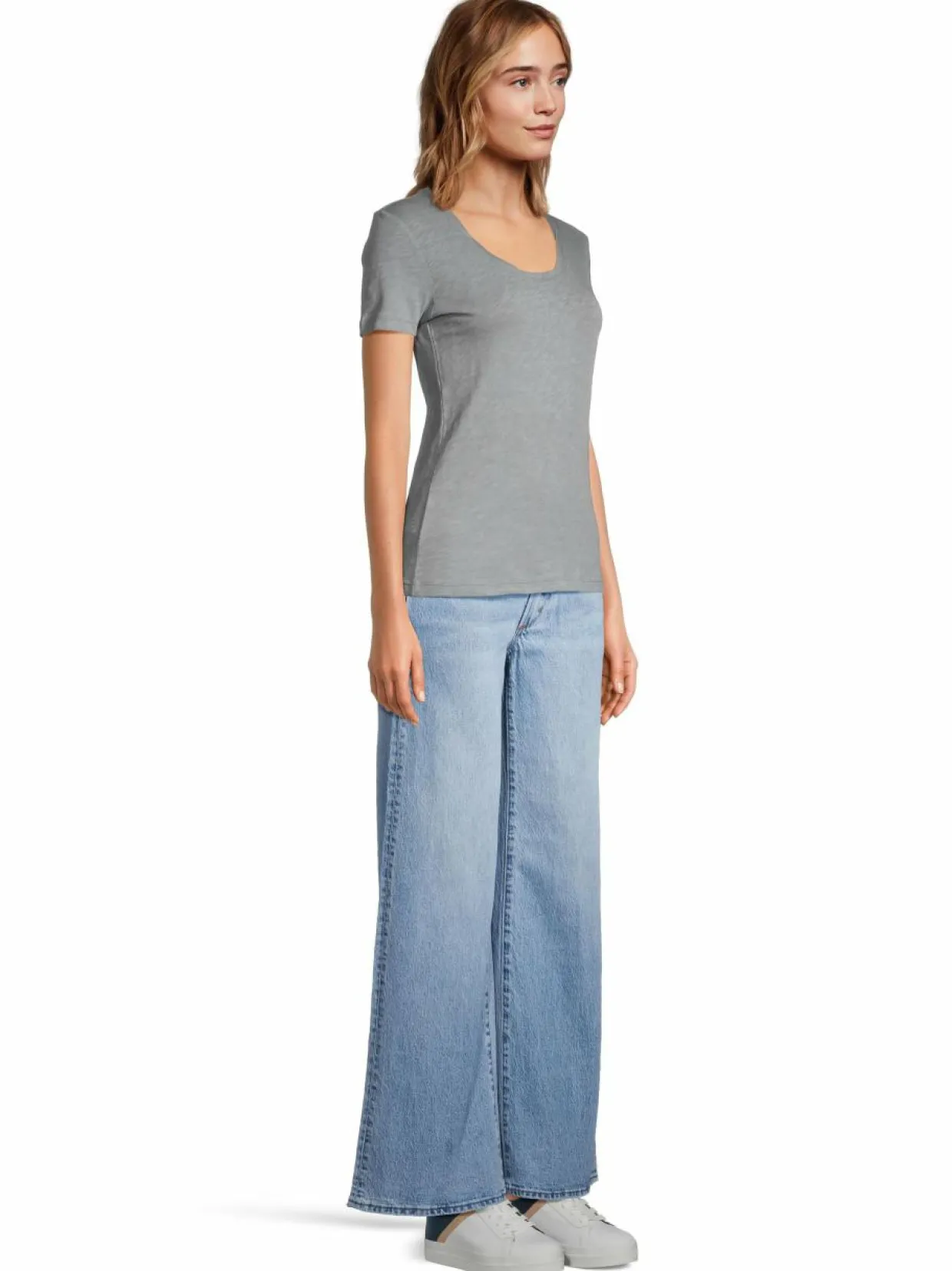 Farkut, jossa on hieman alaspäin levenevät lahkeet, korkea vyötärö ja mukavan väljä mitoitus. Viisitaskuinen malli, jossa kiinnitys vetoketjulla ja napilla. Housut ovat valmistettu luomupuuvillasta, jossa ripaus elastaania lisää joustavuutta.
