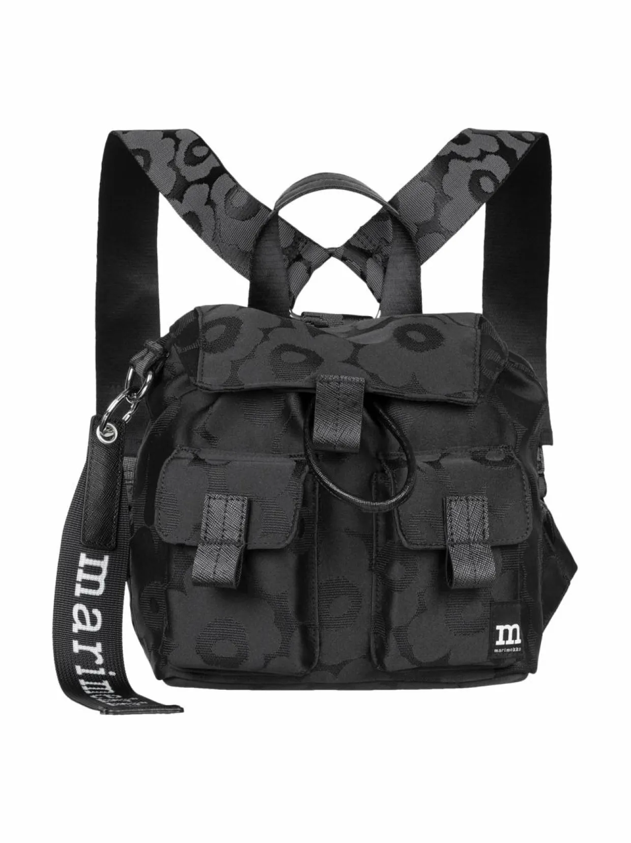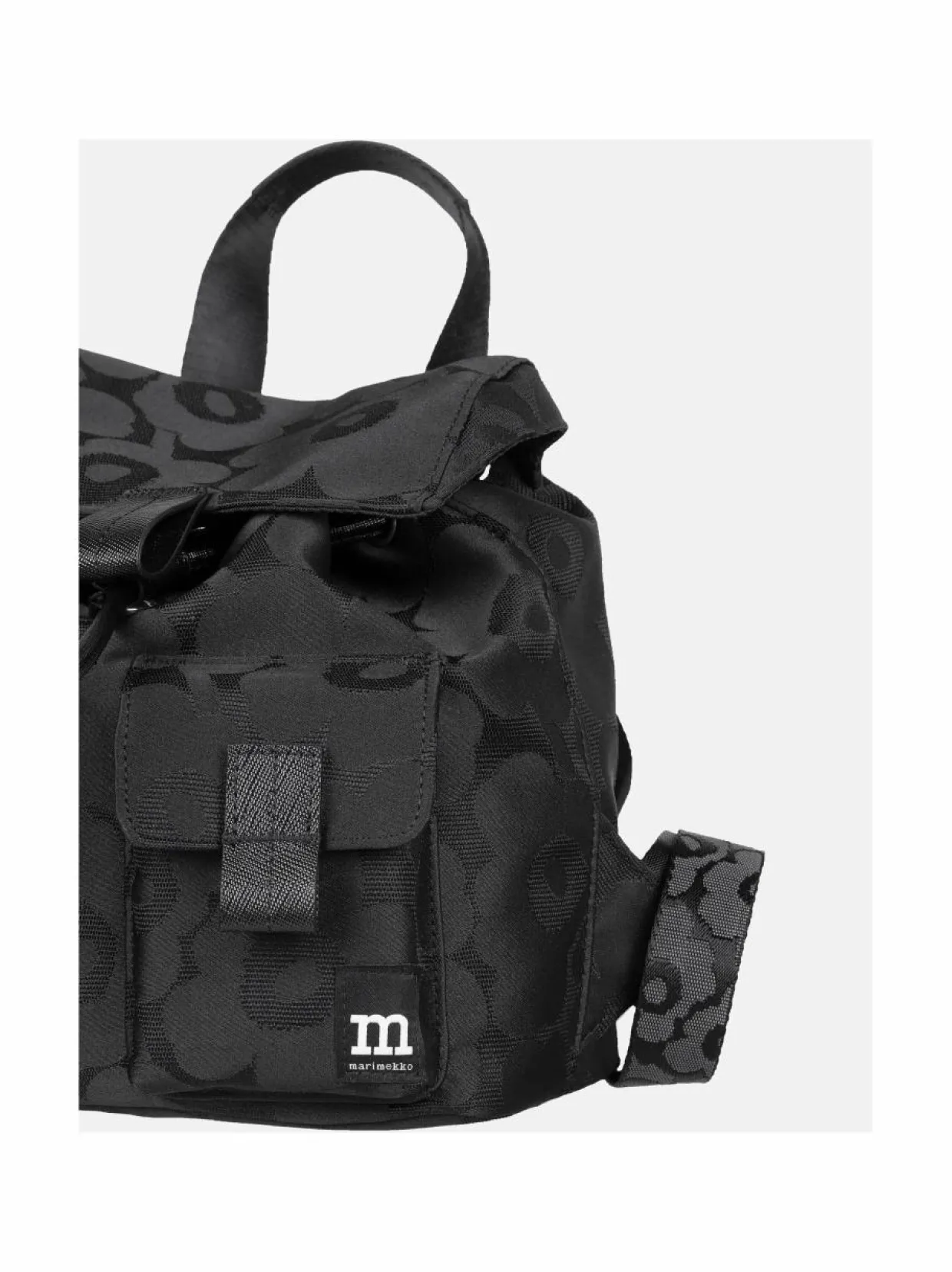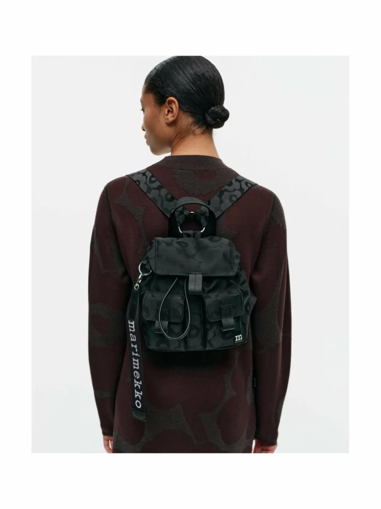 Pieni Everything S -reppu on valmistettu Unikko-kuvioisesta kierrätetystä jacquard-neuloksesta polyesterista. Repussa on kiristysnauhakiinnitys, läppä magneettinapilla ja kaksi etutaskua magneettinapeilla. Olkaimet ovat säädettävät. Toisella puolella on Marimekko-avaimenperä ja takana sisäänvedettävä tasku. Laukussa on nahkaisia yksityiskohtia.