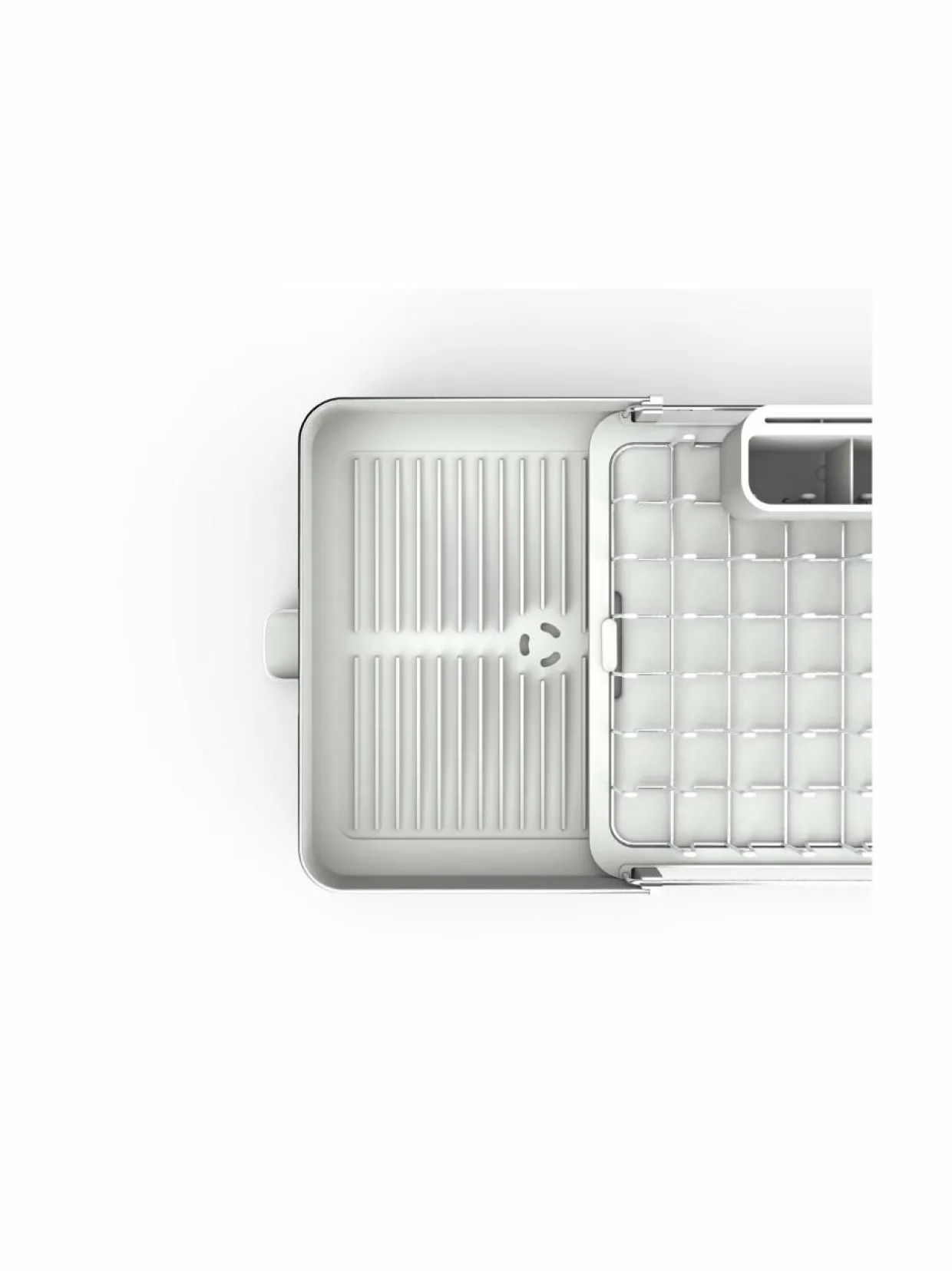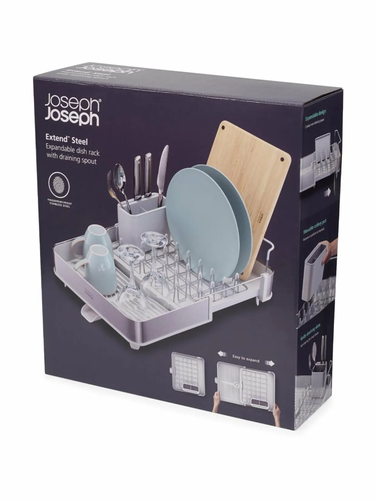 Extend-astiankuivatustelineen kokoa voi säädellä kätevästi tarpeen mukaan. Telineessä on paikat niin lautasille, laseille kuin aterimillekin. Telineessä on 3 eri asentoon säädettävä tyhjennysnokka, jonka kautta vesi valuu pois.
