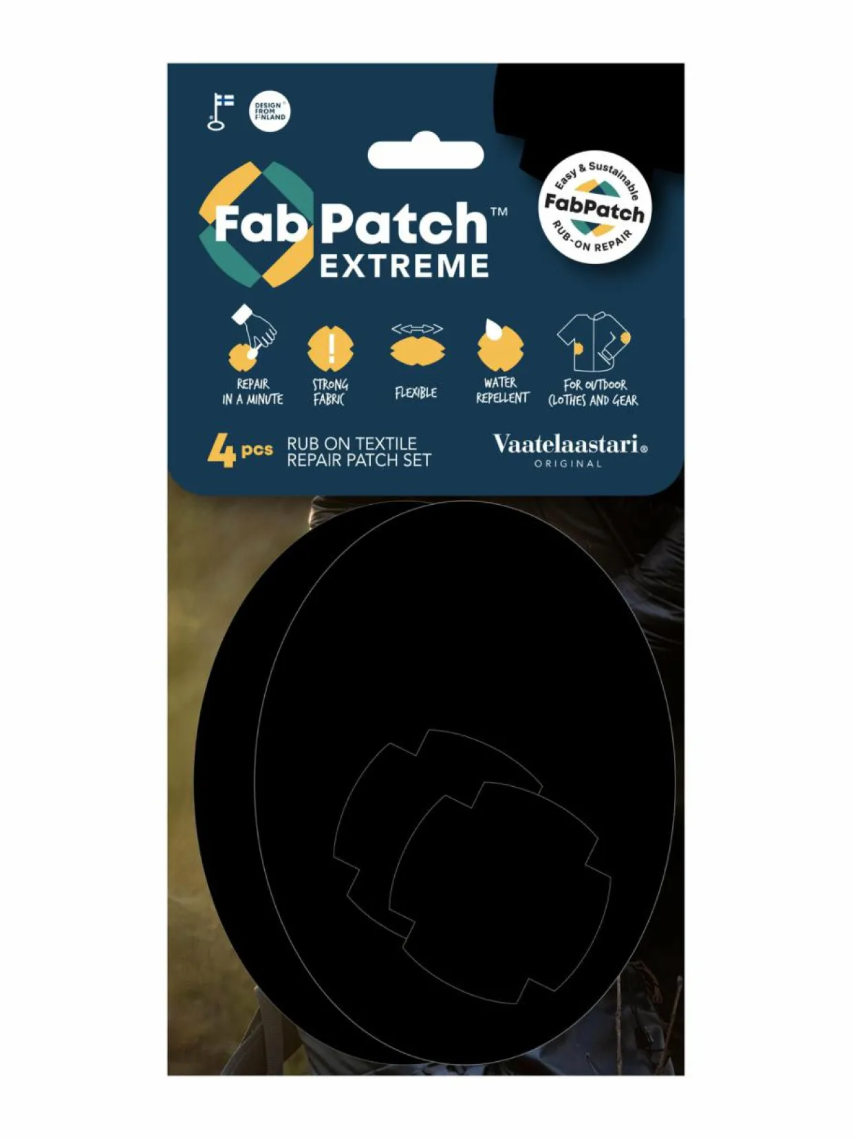 FabPatch™ Vaatelaastari® on helppo ja kestävä hierottava tekstiilien korjauslaastari.Extreme-vaatelaastarin hankauksenkesto ja vedenhylkivyys tekevät siitä erinomaisen tekstiilipaikan erityisesti ulkovaatteille- ja varusteille. Mutta Extremellä voit korjata lähes mitä tahansa – rajana on vain mielikuvitus! Kaikki Vaatelaastari -tuotteet kiinnittyvät helposti hankaamalla – missä ja milloin tahansa.Vaatelaastarit sopivat esimerkiksi toppahousujen, verkkareiden, kenkien, tuolien ja reppujen paikkaamiseen. Tuote soveltuu sekä joustaviin että joustamattomiin tekstiileihin ja myös monille sisävaatteille.Pieneen tilaan mahtuvia paikkoja kannattaa myös pakata mukaan menoihin, sillä voit korjata niillä jopa heti paikan päällä!