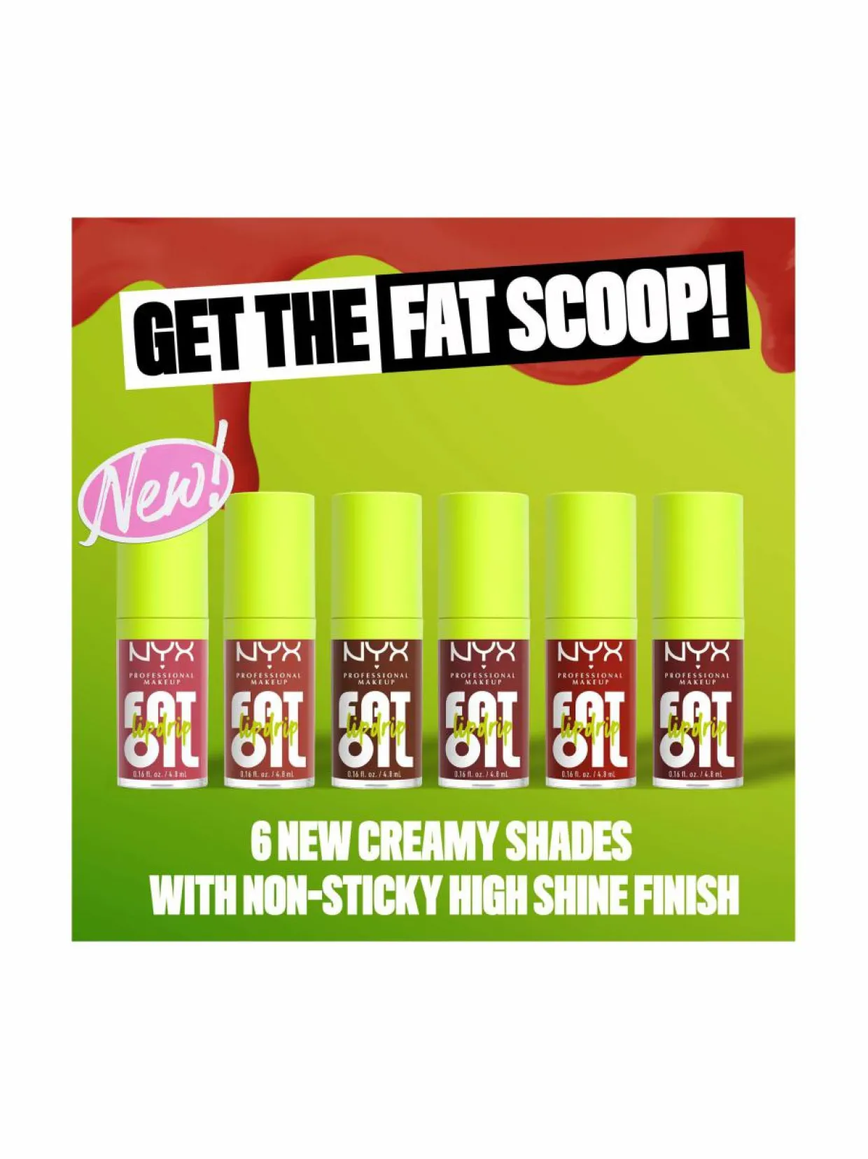 NYX Professional Makeup Fat Oil Lip Drip täyteläinen huuliöljy suojaa huulia, kosteuttaa koko päivän eikä tunnu tahmaiselta. Miellyttävän tuntuinen ja erittäin kiiltävä. Koostumus sisältää lakan- ja vadelmansiemenöljyä sekä skvalaania. Kookas applikaattori miellyttävään ja helppoon levitykseen.