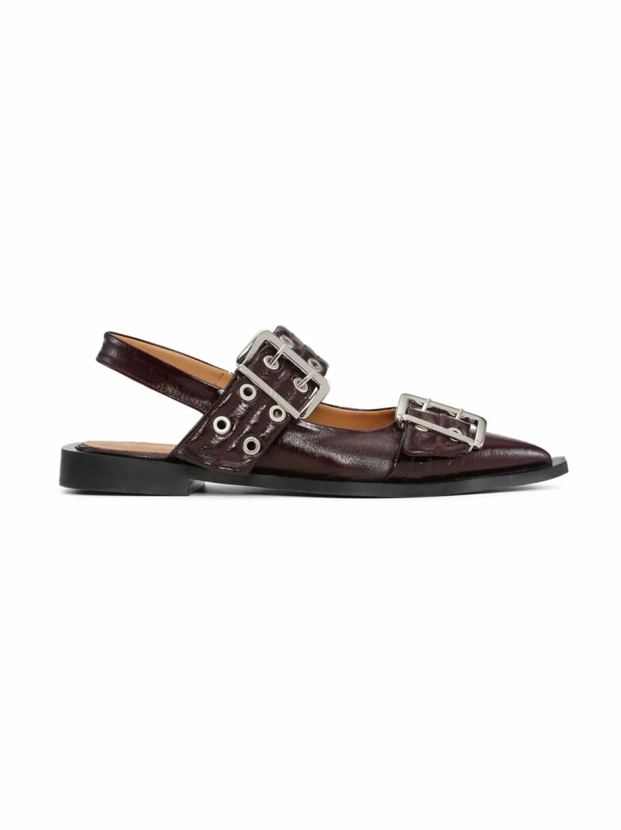 Ikoniset GANNI Feminine Buckle -ballerinat on valmistettu kiiltävästä tekonahasta. Tuote sisältää myös kierrätysmateriaaleja. Niissä on koristeelliset soljet sekä kätevä slingback-remmi. Pehmeä ja joustava materiaali tuntuu mukavalta jalassa.