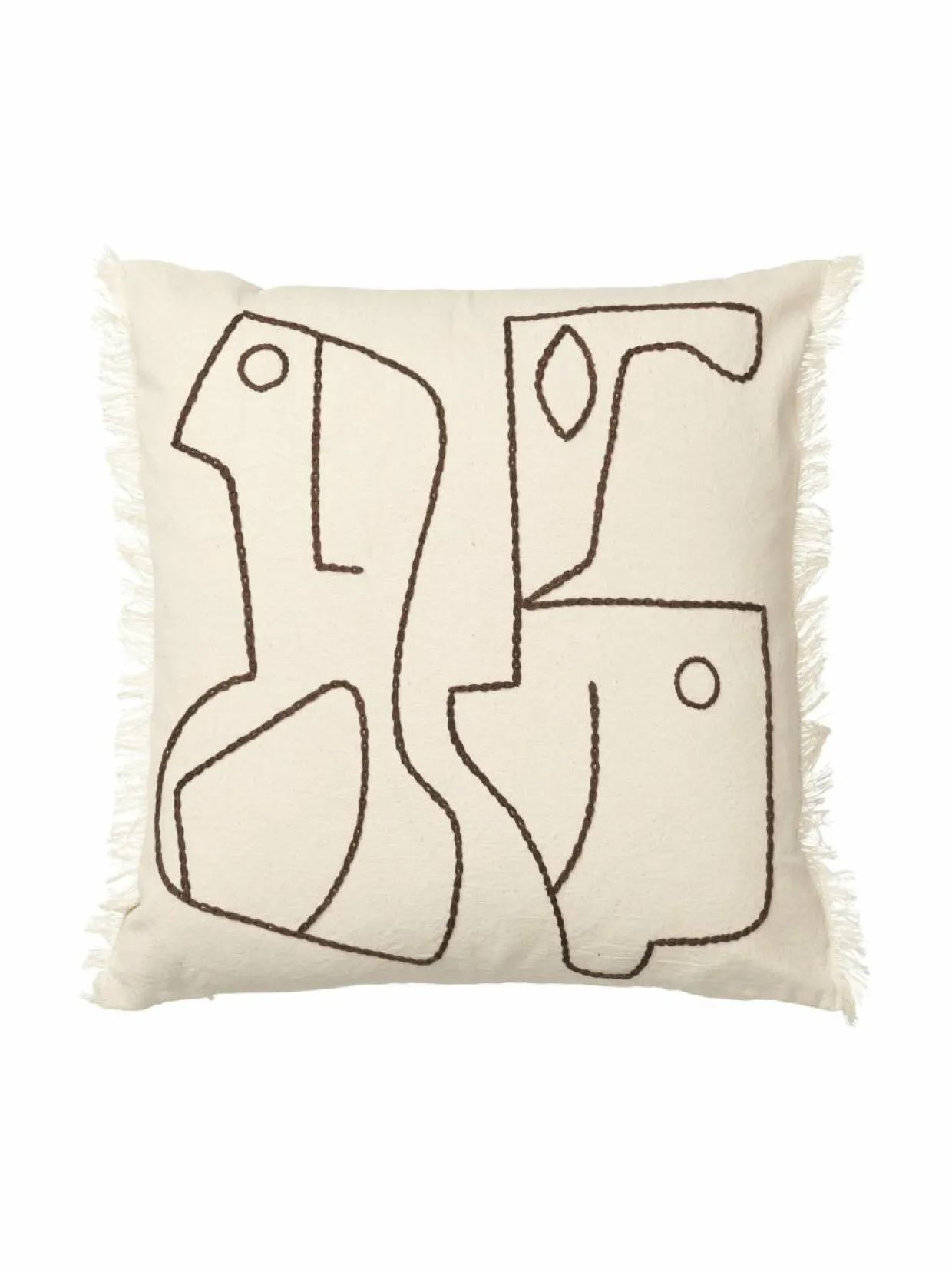 Luomupuuvillasta valmistettu tyynynpäällinen sisältää abstrakteja veistoksellisia hahmoja ja käsin kirjailtuja yksityiskohtia. Tyylin viimeistelevät hapsut. Valitsemalla luomupuuvillatuotteita tuet kestävämpää ja turvallisempaa puuvillatuotantoa.