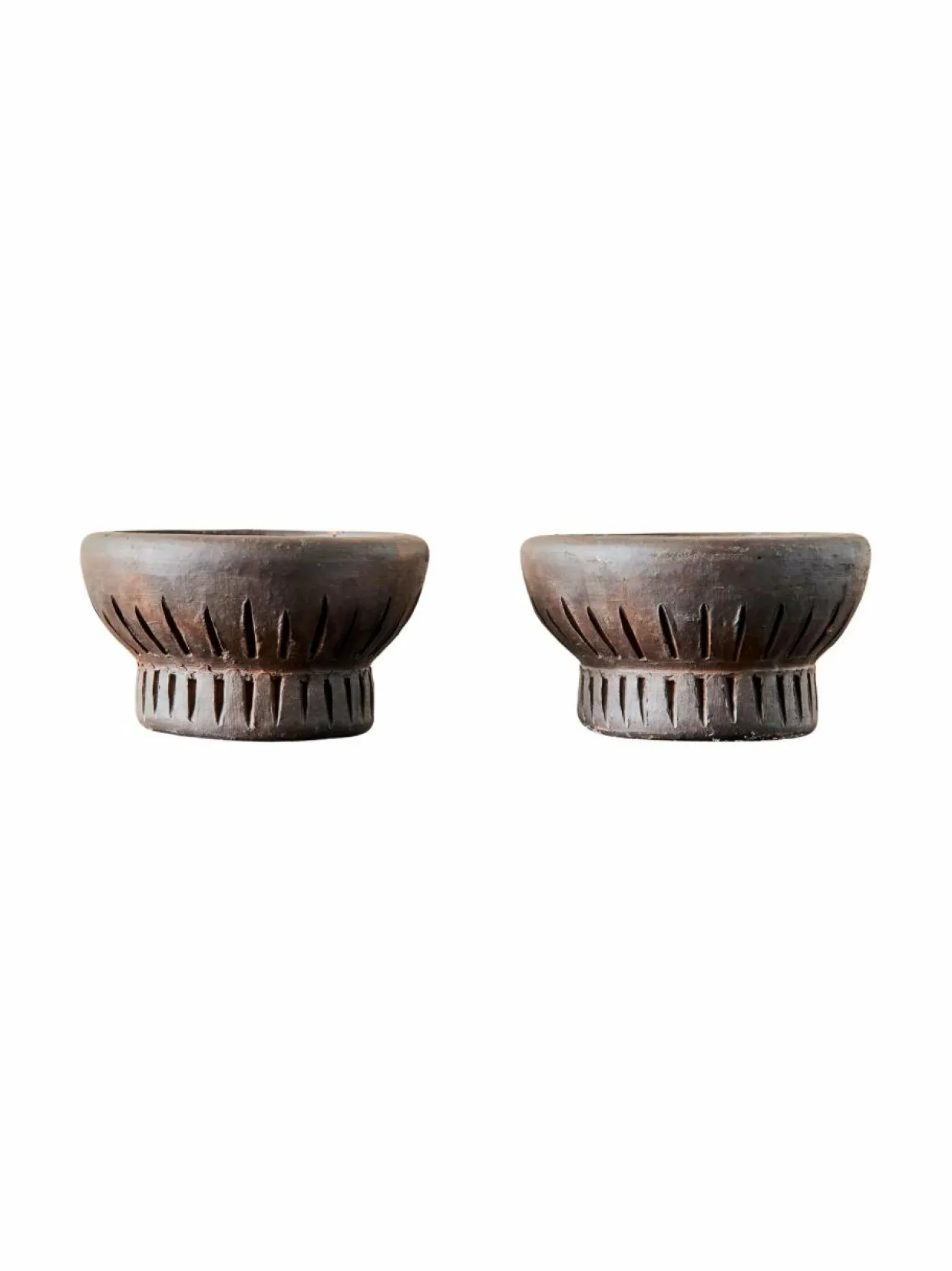 Kaksi kappaletta uniikkeja, luonnonläheisiä kynttiläalustoja terracotta-keramiikasta. Ne luovat sielukasta, eläväistä tunnelmaa kotiisi. Jokainen alusta on käsitelty yksilöllisesti. Suunnitellut Birgitte Rømer.