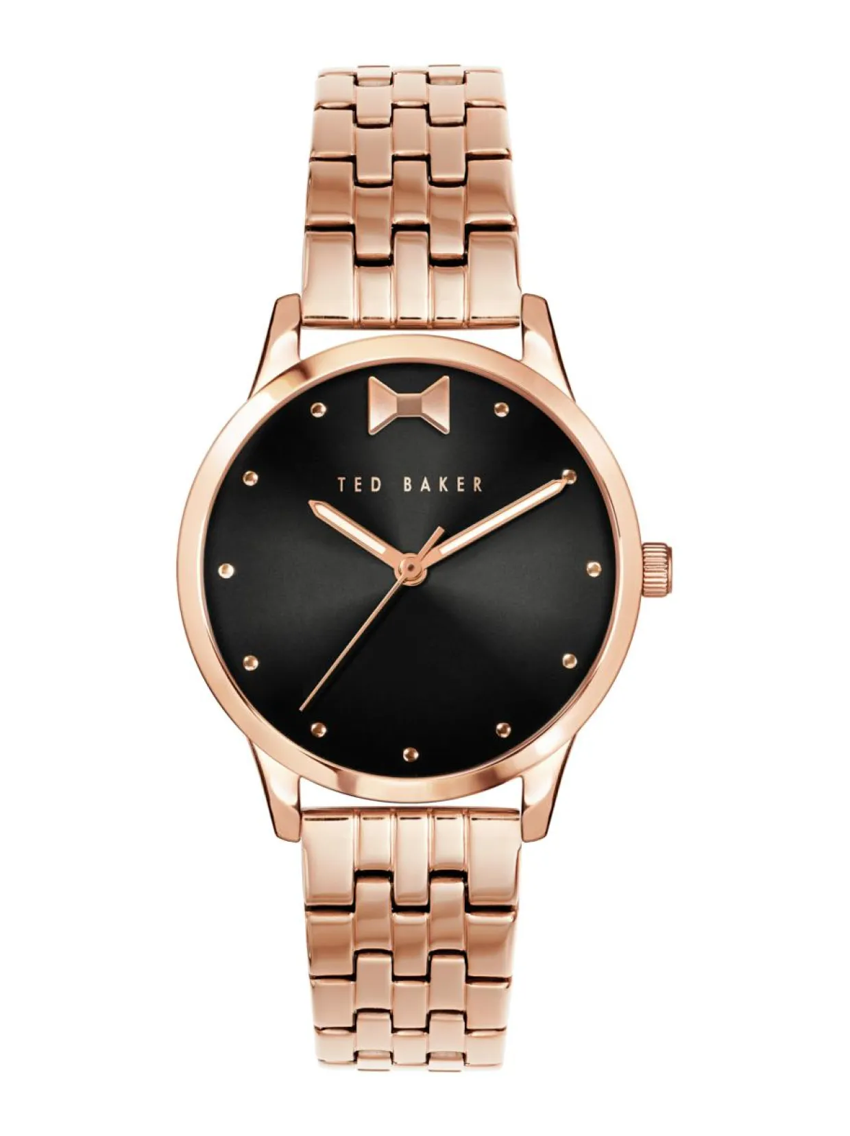 Ted Baker Fitzrovia Bow 34mm rannekello on helppo valinta, kun asuun halutaan lisätä eleganssia ja naisellisuutta. Kellon ruusukullanvärinen runko on valmistettu ruostumattomasta teräksestä. Sen leveys on 34mm ja paksuus on 8mm. Tässä kellossa on ruusukullanvärinen metalliranneke, joka on valmistettu ruostumattomasta teräksestä. Kellon mustaa taulua koristavat ruusukullanväriset palloindeksit ja ruusukullanvärinen rusetti kahdentoista kohdalla. Kellossa on mineraalilasi ja kvartsikoneisto. Kellon vesitiiviys on 5ATM. Ted Baker kelloilla on 2 vuoden takuu.